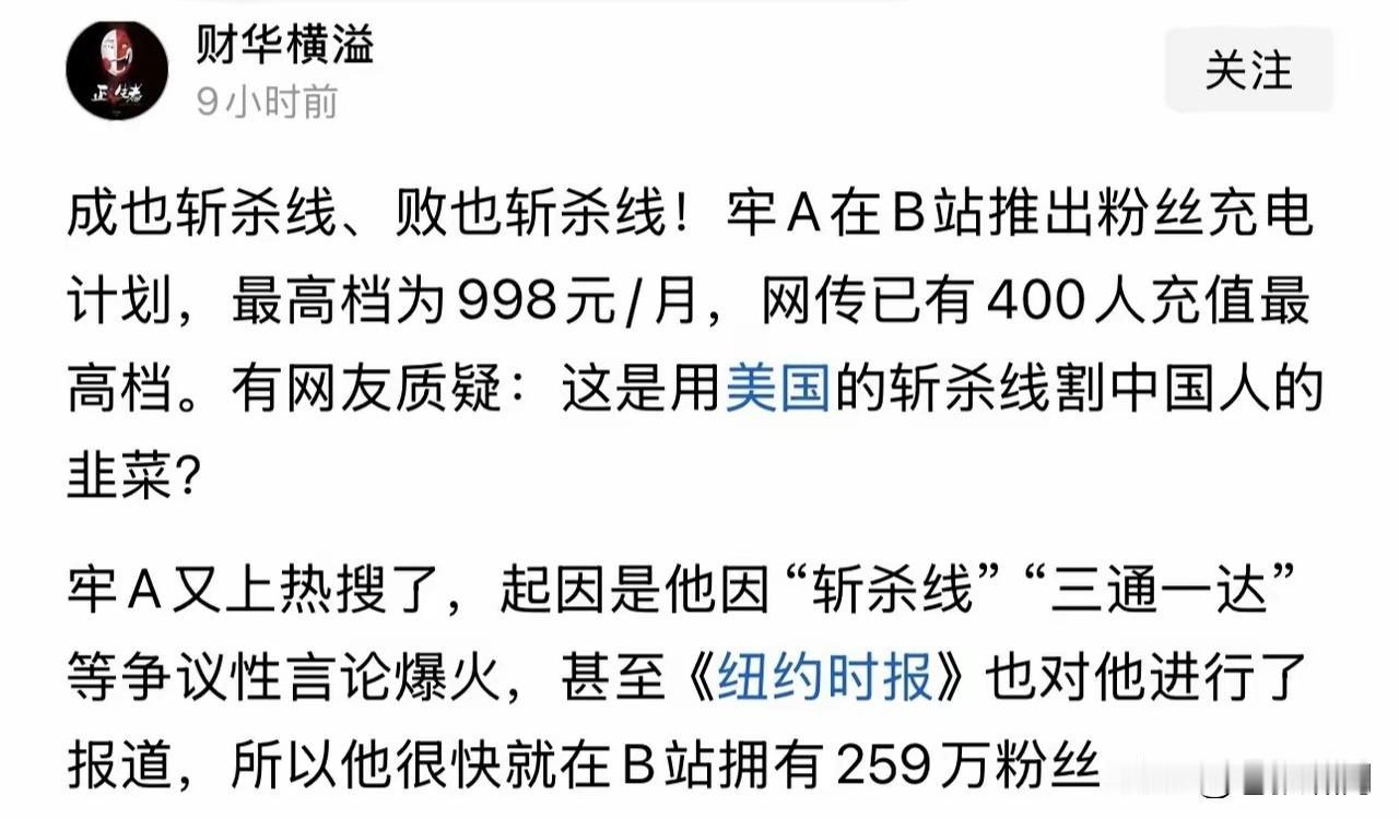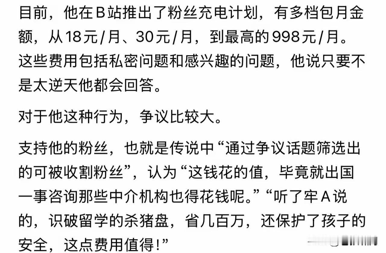 牢A头条开号没火,抖音开号没火!想不到B站开号火了,已有360万粉丝! 他在头条和抖音为何没火?本人觉得原因两点:一是以偏概全,一叶障目反应美国社会,还伤害女同胞留学生群体。 二是太“有才”,创造“高达”“糖霜苹果”“迪斯科米”“三通一达”词汇,太恐怖。遭到国内外媒体与网友批评的所致? 他在B站为何火了?因为打出“充电”招牌,分“包月”和“自定义”两种。“包月”每月998元,“自定义”每月18元~30元不等。已有400人包月可见吸引力。 什么叫“充电”?应该是“以留学美国身份”现身说法,和粉丝介绍美国社会,以及“是否去留学美国”的建议吧? 他在B站开号,很快拥有360万粉丝,说明网友对老美社会“真实面貌”,以及“赴美留学”问题,还是挺感兴趣。 苍狼担心的是:牢A一个留学美国失败,仓惶逃回来的人,只顾怨恨发泄,能给人提供什么全面客观真实情况呢? 尤其是“三通一达”,把女留学生群体说得如此不堪!不仅侮辱女留学同胞,还造成恶劣影响,会导致什么后果? 那些想靠“掏钱充电”,为子女是否赴美留学,了解美国真实情景的网友,能从牢A嘴里了解到什么真实情况呢? 最后想对“充电”网友说一句话:不要因为牢A以偏概全建议,影响了孩子未来?因为他有阴影,建议必有偏颇啊! 同时预测牢A前景:他的暂时爆红不会长久!因为他的吃相,比司大侠张豆奶高喇叭还难看!这种吃相能长久吗? …………