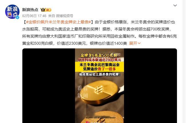 金银价飙升米兰冬奥金牌史上最贵 金银价疯涨,米兰冬奥会奖牌身价飙升!超700枚奖牌用回收金属造,金牌含6克金、500克银,价值近2300美元,或成奥运最贵。运动员们可得加油了,争取多拿几块,直接实现金银自由