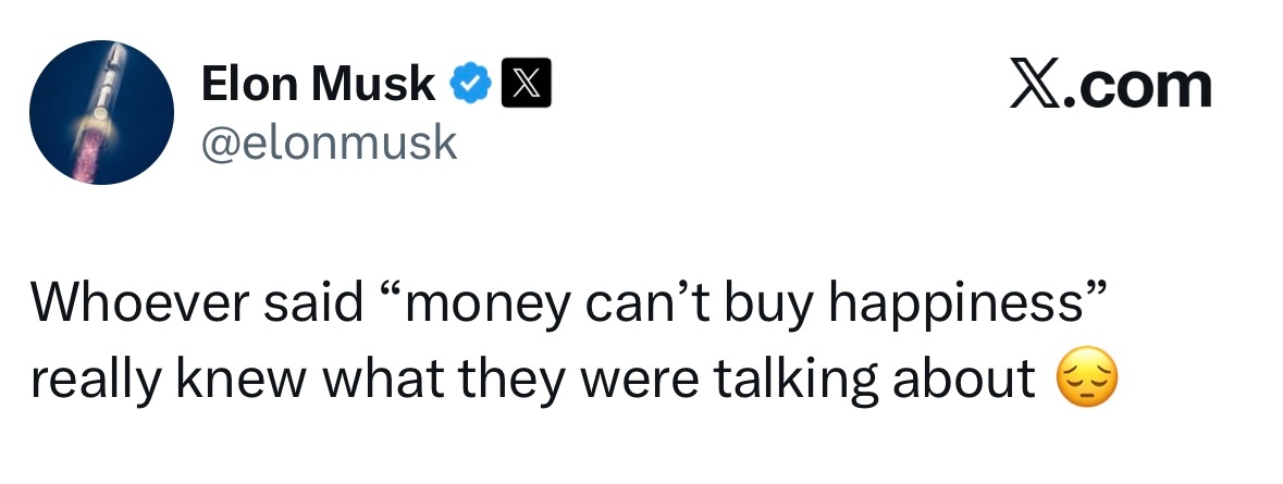 埃隆·马斯克对“金钱买不来幸福”表示认同。最后配的表情😔也深意满满。热点现场海外新鲜事