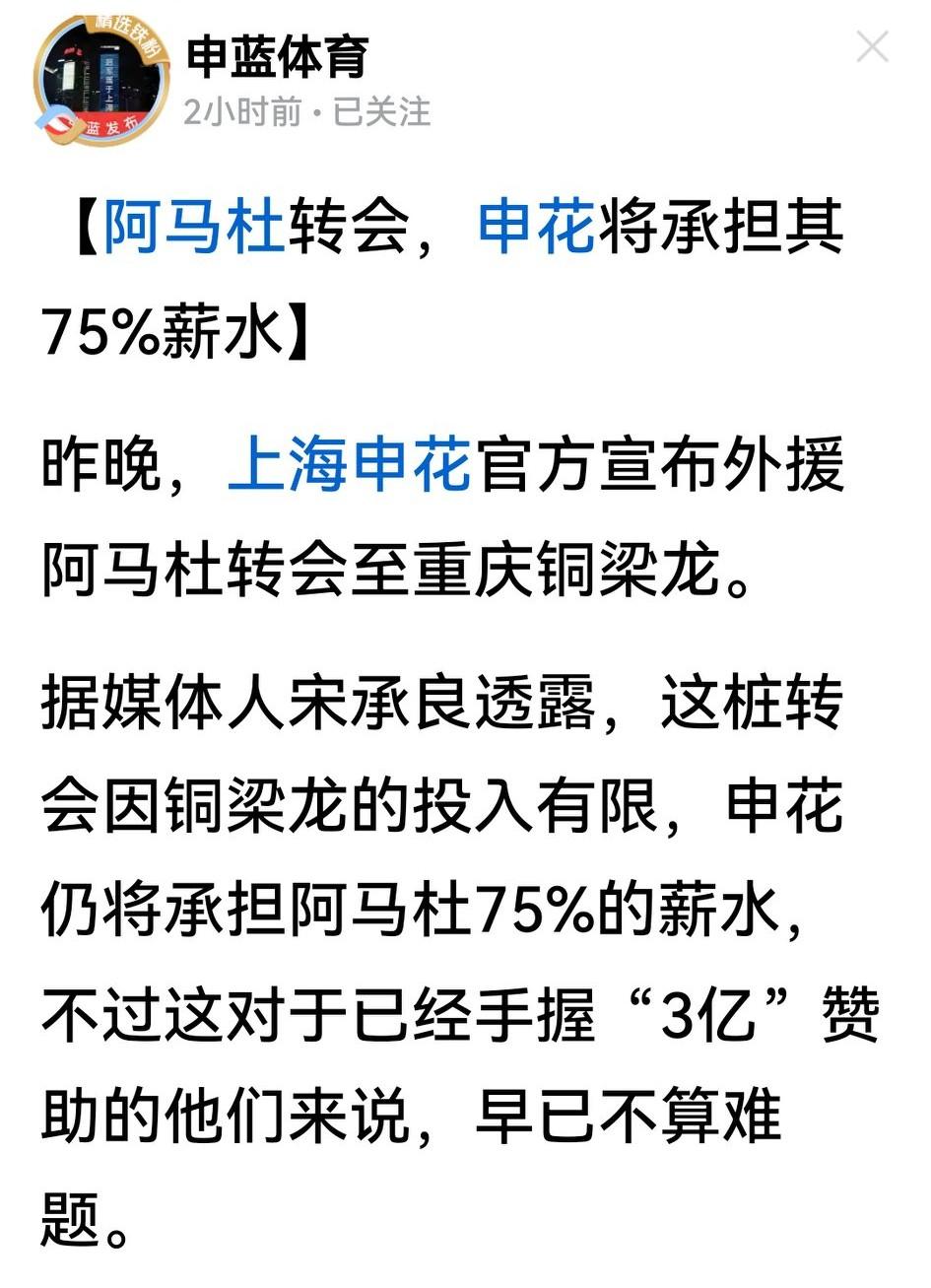 天上真能掉馅饼?没问题!法国人阿玛杜自由身离沪入渝,让铜梁龙捡了个超大便宜! 阿玛杜曾征战法甲、西中,能力毋庸置疑,只因上年因伤缺了大半赛季,如今就被不差钱儿的申花赔上嫁妆、不要彩礼嫁出去。但对缺钱的铜梁龙来讲,这无疑是望外大喜。 听说过免费租借,也听说过东家免费还承担薪水的租借,却未听说合约期被“0元购”转会后老东家还承担75%的薪水。从这个角度讲,龙龙运作阿玛杜转会的这笔生意,创造了中国足球的奇迹。