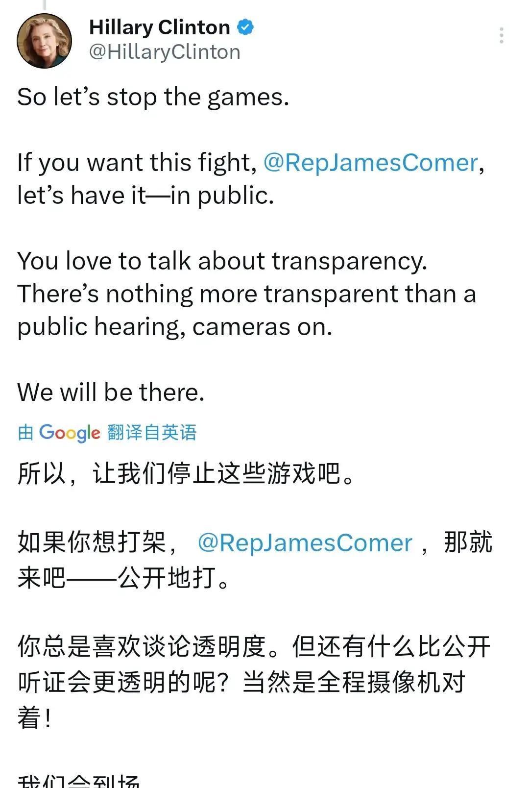 希拉里要求就爱泼斯坦案举行全程直播的公开听证会。 2月5日晚上,她在社交平台点名众议院监督委员会主席詹姆斯·科默,质疑他一再高喊“透明度”,却迟迟不给一次真正公开的程序。 她提到,过去约6个月,她和相关人员多次与共和党议员沟通,并按要求宣誓作证,把自己掌握的全部情况交代清楚,却发现规则被反复修改、口径一再变。 在她看来,本应围绕一宗涉及多方政商名流的严重案件厘清责任,却逐步被操作成一场以民主党为靶心的政治秀,爱泼斯坦的姓名反而成了方便传播的“标签”和“流量入口”。 2月2日,克林顿夫妇同意出庭作证,并请求众议院推迟原定4日就“藐视国会”进行的表决,她也随即提出:既然强调公开,那就让摄像机从第一分钟录到最后一分钟,让所有质询都在镜头前完成。 目前,科默方面尚未就是否接受这种全程公开的听证形式给出明确回应,两党围绕这一听证会的下一步较量,可能在2026年的舆论场上持续发酵。 当政治调查与电视转播高度绑定时,公众究竟更在意一次完整的听证过程,还是那几十秒被反复剪辑的高光片段,这会不会改变他们对真相与责任的判断方式?