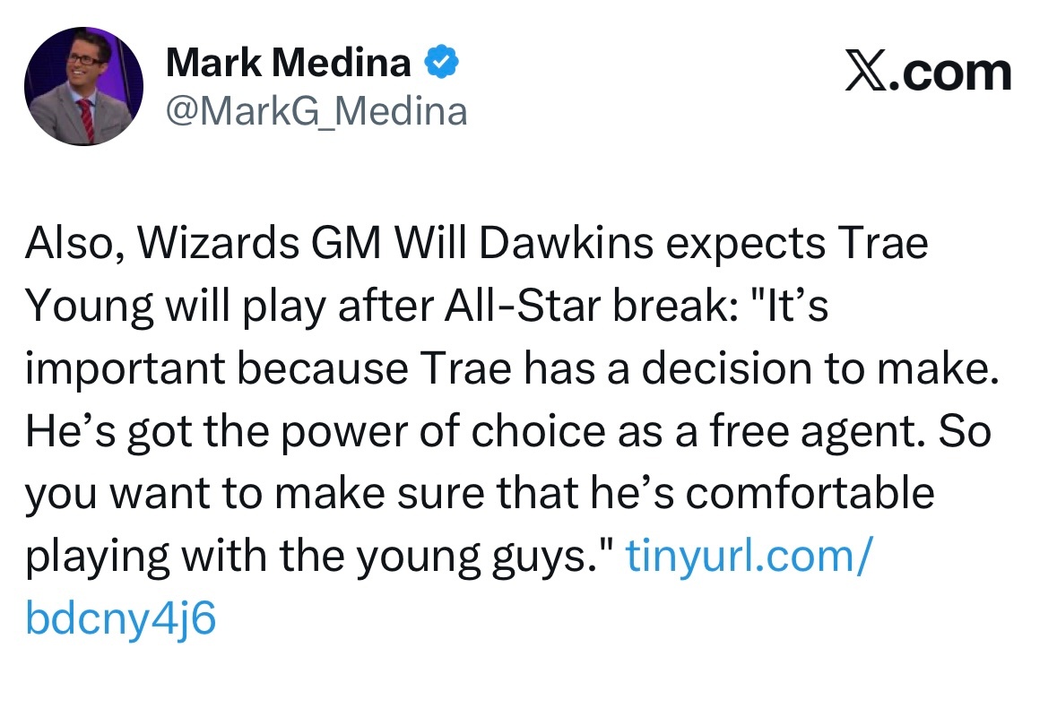 Mark Medina:奇才总经理道金斯预计特雷·杨将在全明星赛后复出:“这很重要,因为特雷需要做出决定。作为自由球员,他拥有选择权。所以我们要确保他在和年轻球员一起打球时感到舒适。”