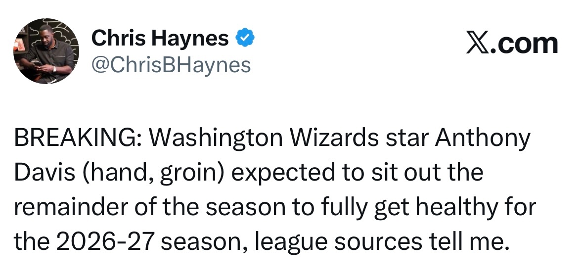 Chris Haynes:浓眉赛季报销 戴维斯因手部和腹股沟伤势,预计将缺席本赛季剩余所有比赛,全力养伤为2026-27赛季做准备。