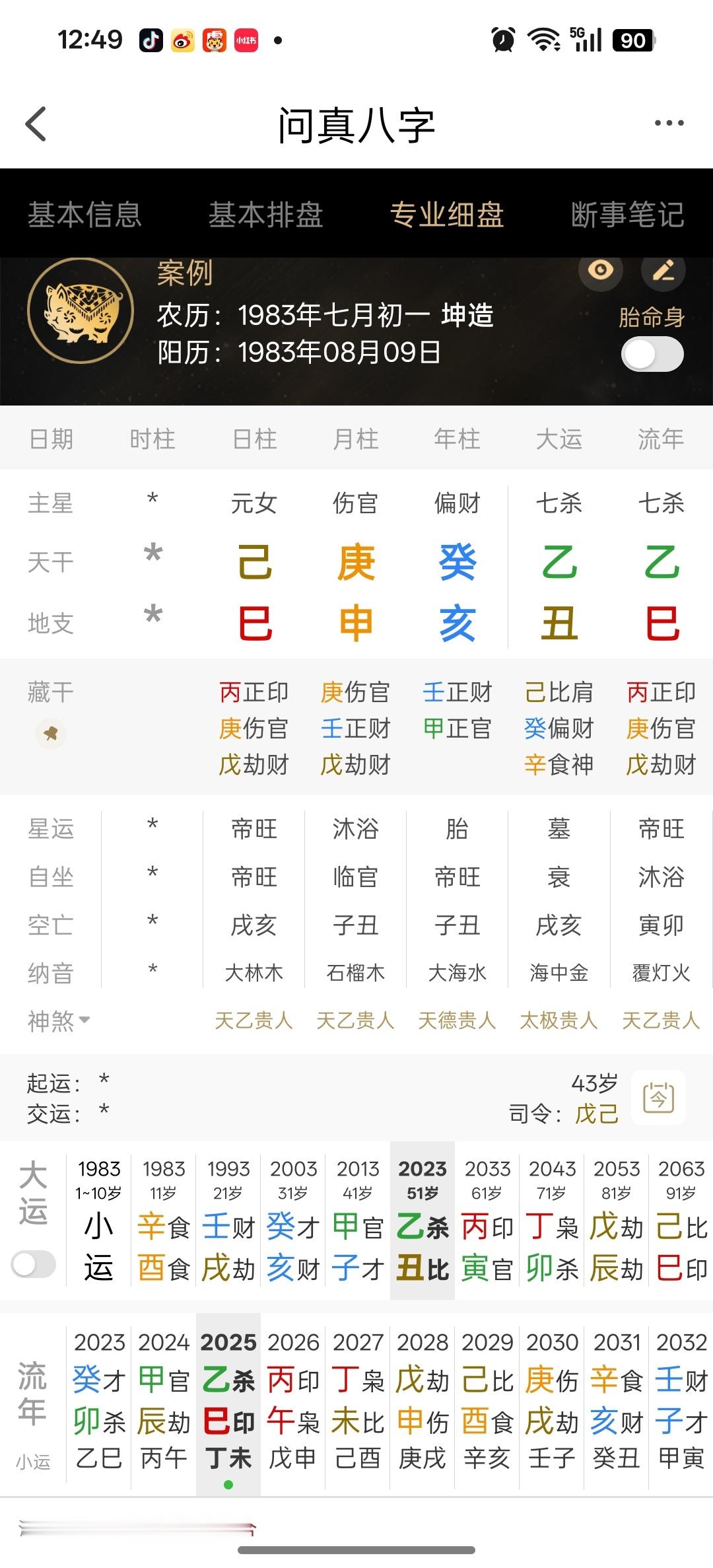 昨天暂时没找到,今天在百科上翻到了1983年8月9日 癸亥 庚申 己巳 时辰不详,但是估计不是巳午未时。不然不会死得早。