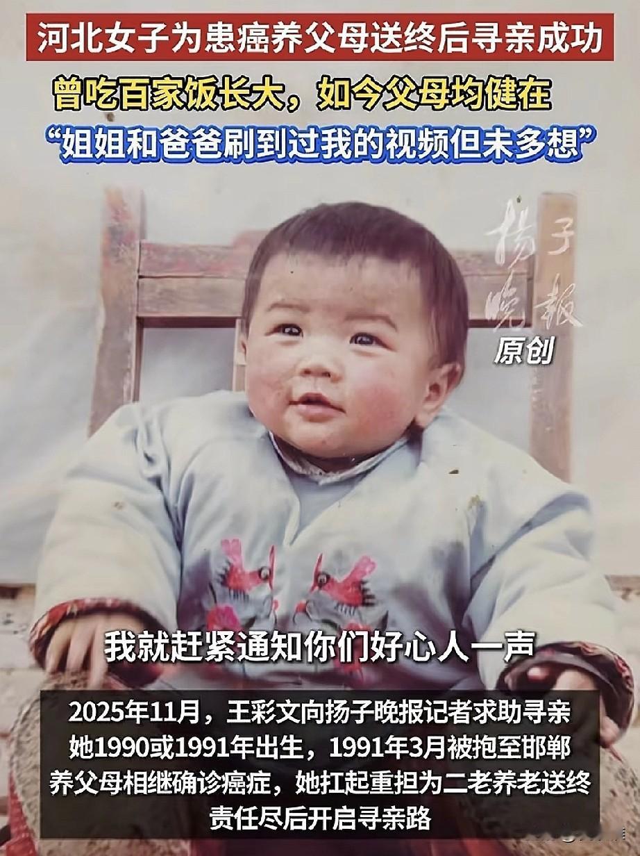女子从小就知道自己是被养父母抱养回来的,养父母对她也是视如己出,给了她全部的关爱,这让她感觉自己从未缺少过什么,也没有觉得在别人面前抬不起头,后来养父母相继患病,她也是一边打工一边照顾两位老人,直到为他们养老送终。 养父母去世后,她在丈夫的鼓励下开始寻亲,从去年十一月开始她在社交媒体上发布寻亲视频,位于湖南衡阳的一位女子看到她发布的视频后,就联系了她进行采血比对,没想到这一次就比对成功,幸运的找到了自己的亲生父母,他们都还健在,而联系她采血的女子正是她的亲姐姐,家里还有一个妹妹。女子说自己之所以寻亲就是想知道自己从哪里来,现在自己家庭圆满,心中感激自己遇到的每一个人!