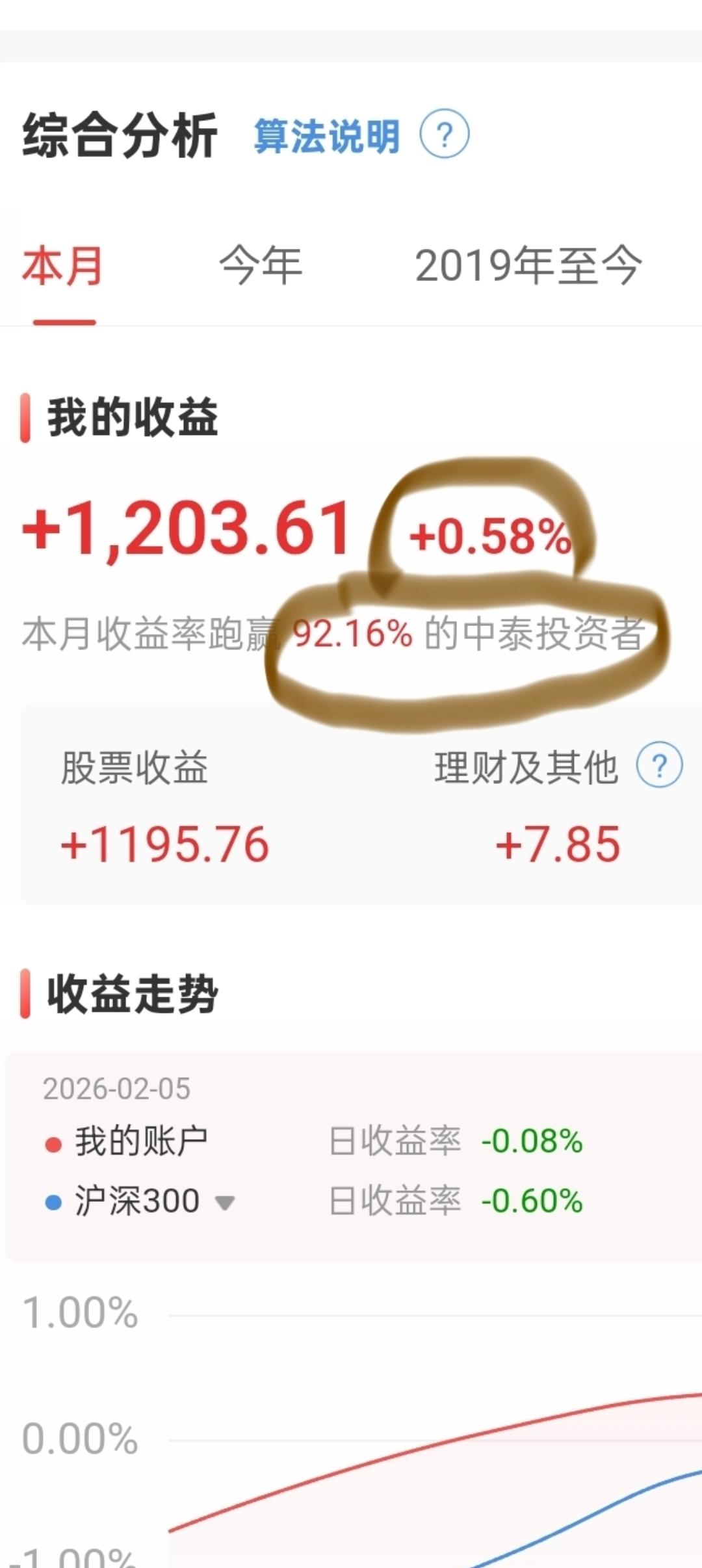 晒晒炒股日记我本月微小的0.58%收益率,就跑赢了92.16%中泰投资者。看看吧,在一赢二平七负的搏弈中,一点点赢利,你就可以站在那个“一”当中。所以我们就别梦想一夜暴富,稳扎稳打才是正道。