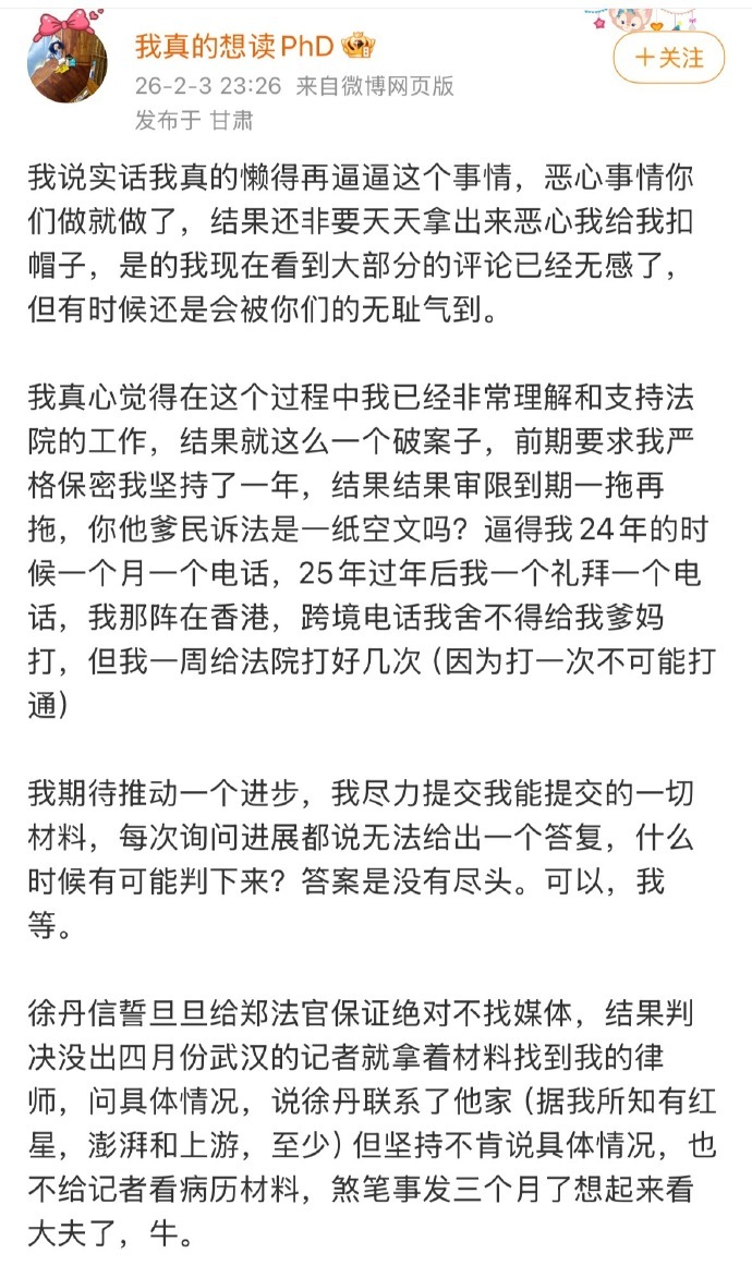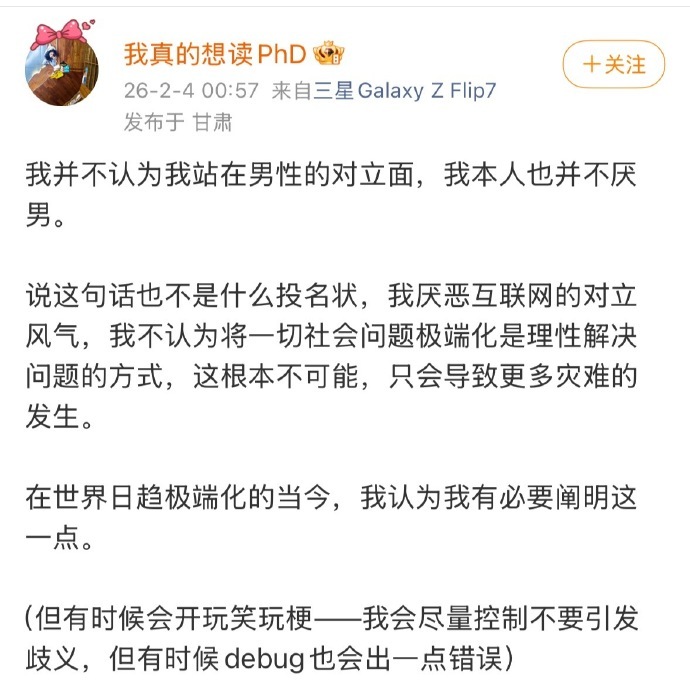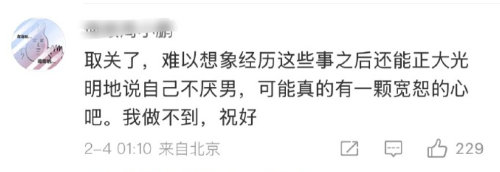 武大图书馆诬告事件还有后续,主角杨景媛这几天发文,居然语气缓和,声称并不厌男,不出意外,评论区被她原本的忠实支持者攻陷。杨景媛的回旋镖,充分说明极端女权的顽疾下,包括女性在内,都是受害者,如果抛开那场诬告,你点开杨景媛的微博,会发现她的日常分享很正常,发发小狗发发美食,她原本也应该有个美好的人生,武大毕业、赴港读博,开启顺风顺水精英人生,她目前的ID还叫“我真的想读PHD”。然而却因被极端思想影响,毁了肖同学,也毁了自己,令人唏嘘。