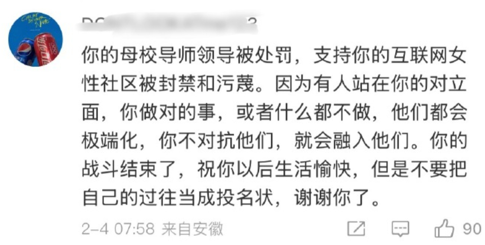 更可惜的,是她客观上已经成为极端性别主义者刻意塑造的一个符号标杆,即便她本人可能并不愿意,甚至想要回归正常,温和一些,但也已经被极端群体绑架起来,请神容易送神难,上了贼船下不来,忠诚不绝对就是绝对不忠诚,陷入自证与内耗的恶性循环。
