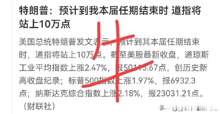 外网传疯了?牛逼吹的震天响? 特朗普刚刚发文说美国股市道琼斯指数要站上100000点。如果真是这样,这可是对全球股市的一种刺激啊,那么,有点闲钱,你要是相信特朗普说的话的话,还不赶紧到证券公司去开个账户。因为美国股市能够翻一倍的话,全球股市都不会差,特朗普任期还有好几年呢?这几年美股指数能够翻一倍,你想想a股能涨到多少点?你随便买也能翻一倍呗😁。就怕是他吹牛逼,兑现不了,那就麻烦了。