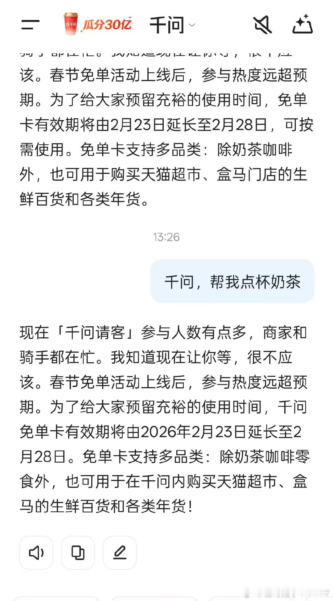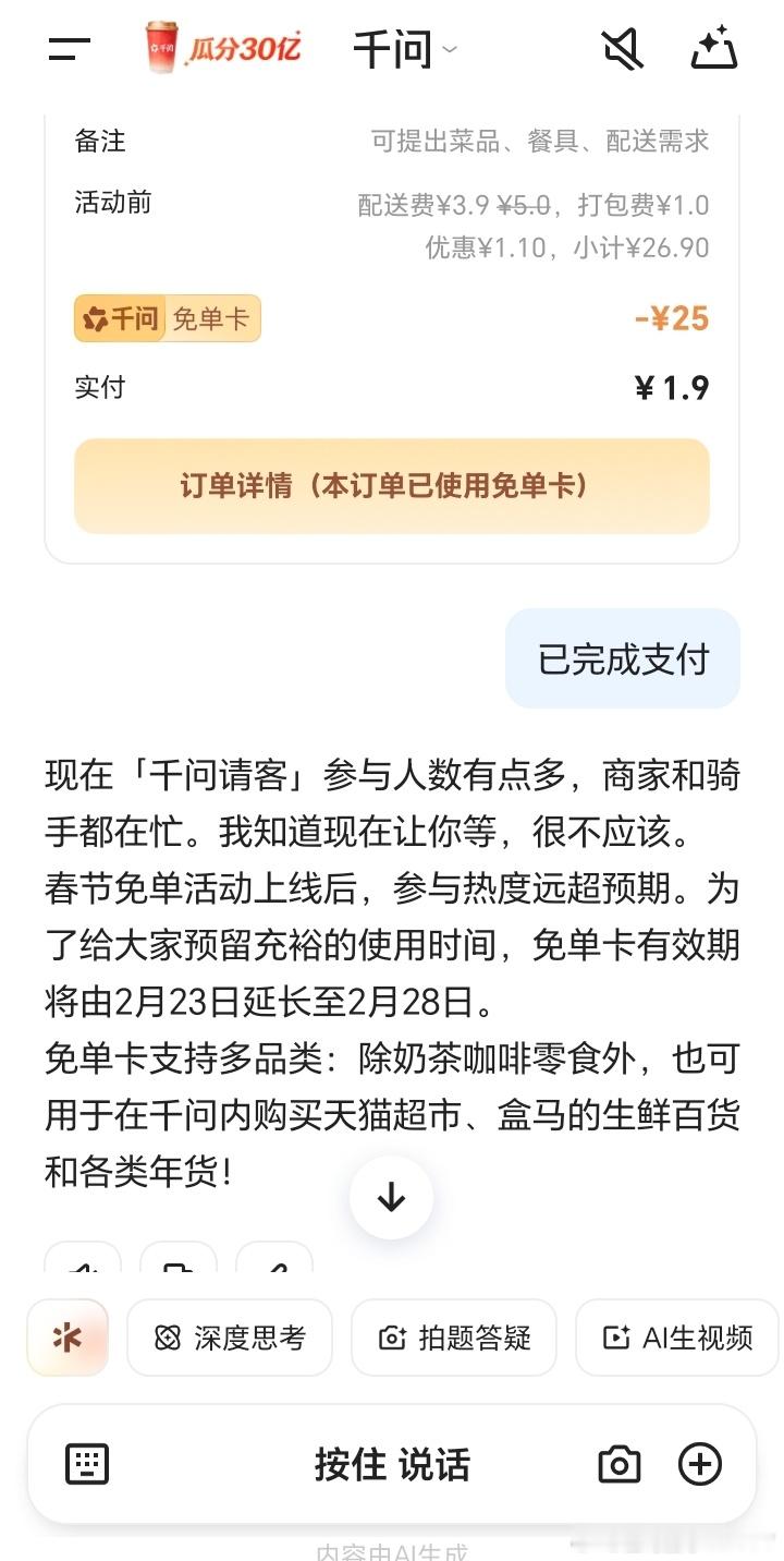 千问让我认识到25元的购买力桂哥评:阿里千问还是很给力很实诚的!这不25元免单卡,咱已经点了,桂哥已亲测有效了。小伙伴们可别忘记用哦。不用白不用。 千问免单卡可以买年货