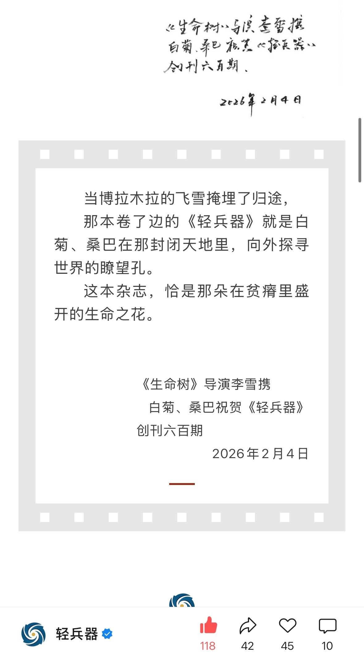 生命树李雪太好玩儿了,好真诚的导演,给轻兵器gzh私信人家没理他,又跑去plq留言导演你这个WX名搁我我也不敢信啊这个gzh做的蛮好的,都是干货科普贴导演还代表白菊、桑巴给杂志送上了祝福“是在那封闭天地里向外探寻世界的瞭望孔”在那个网络还不发达的年代,一本杂志或许就是一个人开启世界认知的引子