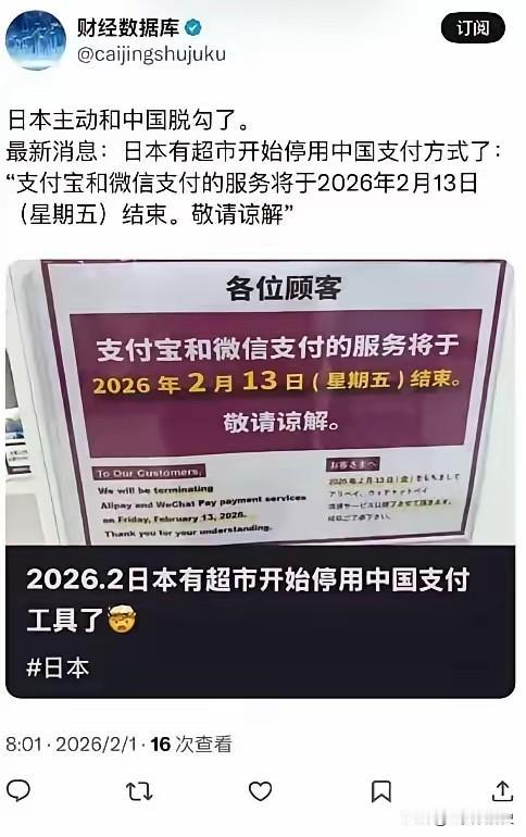 日本主动和中国脱钩了!部分日本超市发通告表示从2月13日起停用支付宝微信,现在日本已经在错误的道路上越走越远。 等等!先别急着下结论,让数据说几句真话。最近日本部分商家的决定,更像是一场脆弱的商业自保,而非坚固的国家战略。有东京商家私下抱怨,他们担心的是人民币汇率波动带来成本风险,才暂时拒绝人民币和移动支付。这更像是汇率焦虑下的应激反应。 把几家店铺的选择,放大成“日本主动脱钩”,实在是言过其实。我们得看看支付方式在日本真正的生存土壤。支付宝和微信支付在日本签约店家一度超过4.5万家,但一个冰冷的事实是,99%的使用者是中国游客和留学生。日本本土消费者几乎不用。 为什么?这无关先进或落后,而是根深蒂固的消费文化。日本人极度重视隐私,反感消费数据被企业收集。他们拥有成熟的信用卡体系,人均持有2.6张信用卡。对很多日本人来说,沉甸甸的现金能带来更踏实的消费节制感。 支付困境背后,是中日经贸关系正在经历的深刻降温。日本首相近期的错误言论,严重伤害了中国人民的感情,恶化了交流氛围。中国相关部门已发布赴日旅游、留学提醒,并暂停进口日本水产品。 经贸“压舱石”的作用正在松动。中国是日本最大的贸易伙伴,但“政冷经热”的旧模式面临考验。日本对华贸易依存度接近20%,而中国对日贸易依存度已降至5%左右。这种不对称的依赖,意味着谁更怕“脱钩”? 冲击已经显现。中国游客曾是日本旅游业的绝对主力,消费力远超平均水平。他们的骤然减少,让日本百货店的免税销售额应声下跌近一成甚至更多。有研究所估算,若此状况持续一年,日本GDP可能被拖累0.29个百分点。 汽车、半导体这些日本出口支柱产业,正面临在华市场的巨大不确定性。而日本心心念念的供应链“去风险化”,试图减少对华依赖。但其国内约三分之一进口品高度依赖中国,这种“脱钩”谈何容易?更像是一种代价高昂的自我消耗。 当然,经贸的韧性依然存在。许多在华日企仍看好中国市场,投资结构正向高端领域优化。中日货物贸易的基础盘也依然庞大。真正的危险在于,政治上的寒流如果持续,最终会冻伤所有经济毛细血管。 几家超市停用支付宝,只是寒流中的一片雪花。它提醒我们,当信任与互惠被削弱,最先枯萎的往往是民间最便利的藤蔓。日本若在错误道路上执迷不悟,最终承受寒冬的,将是它自己的经济与民生。 各位读者你们怎么看?欢迎在评论区讨论。 中方对日本态度 日本对华态度 日本对华贸易 日本贸易政策 日本战略崩盘 日本封锁中国 日本线下经济