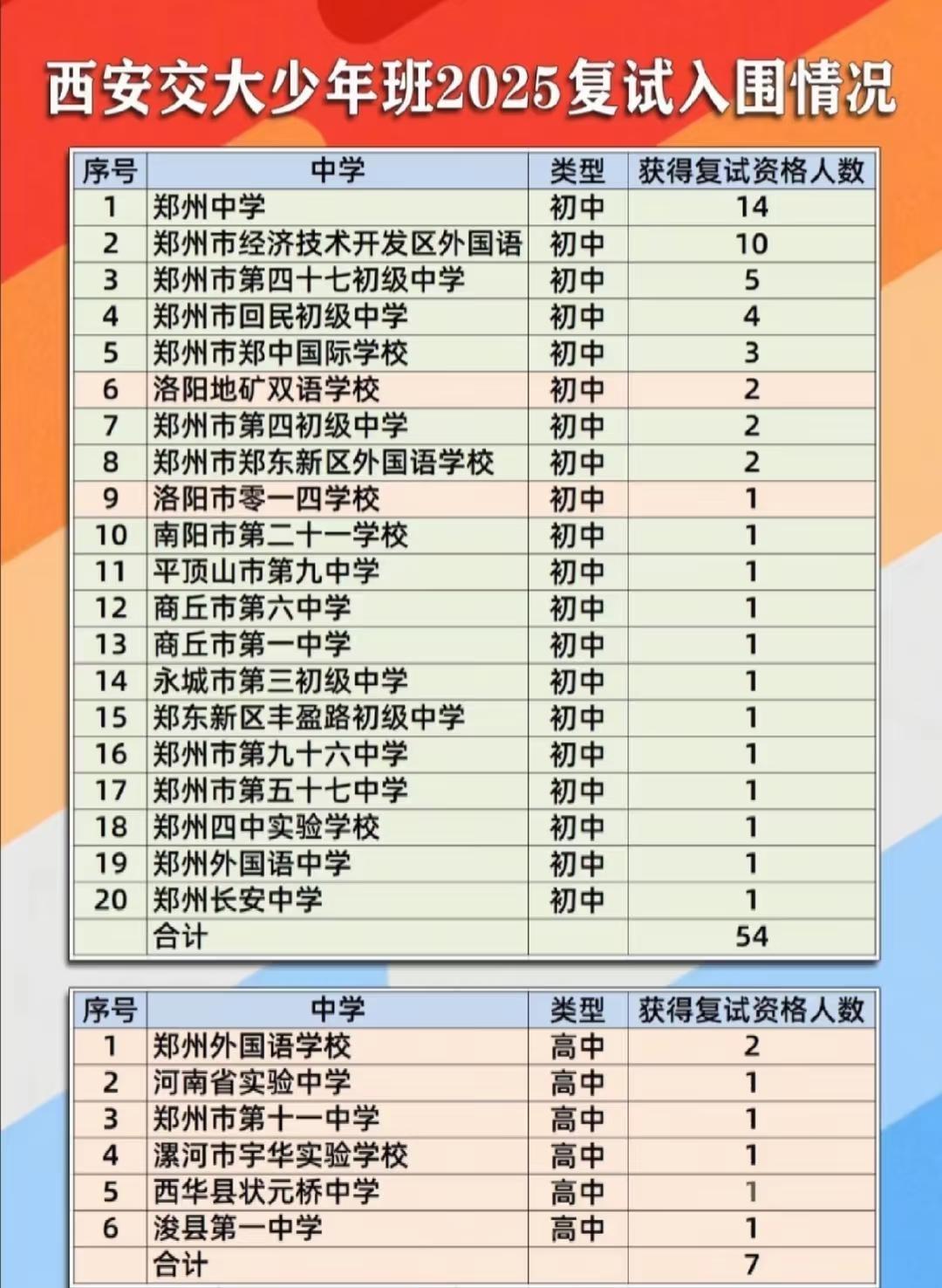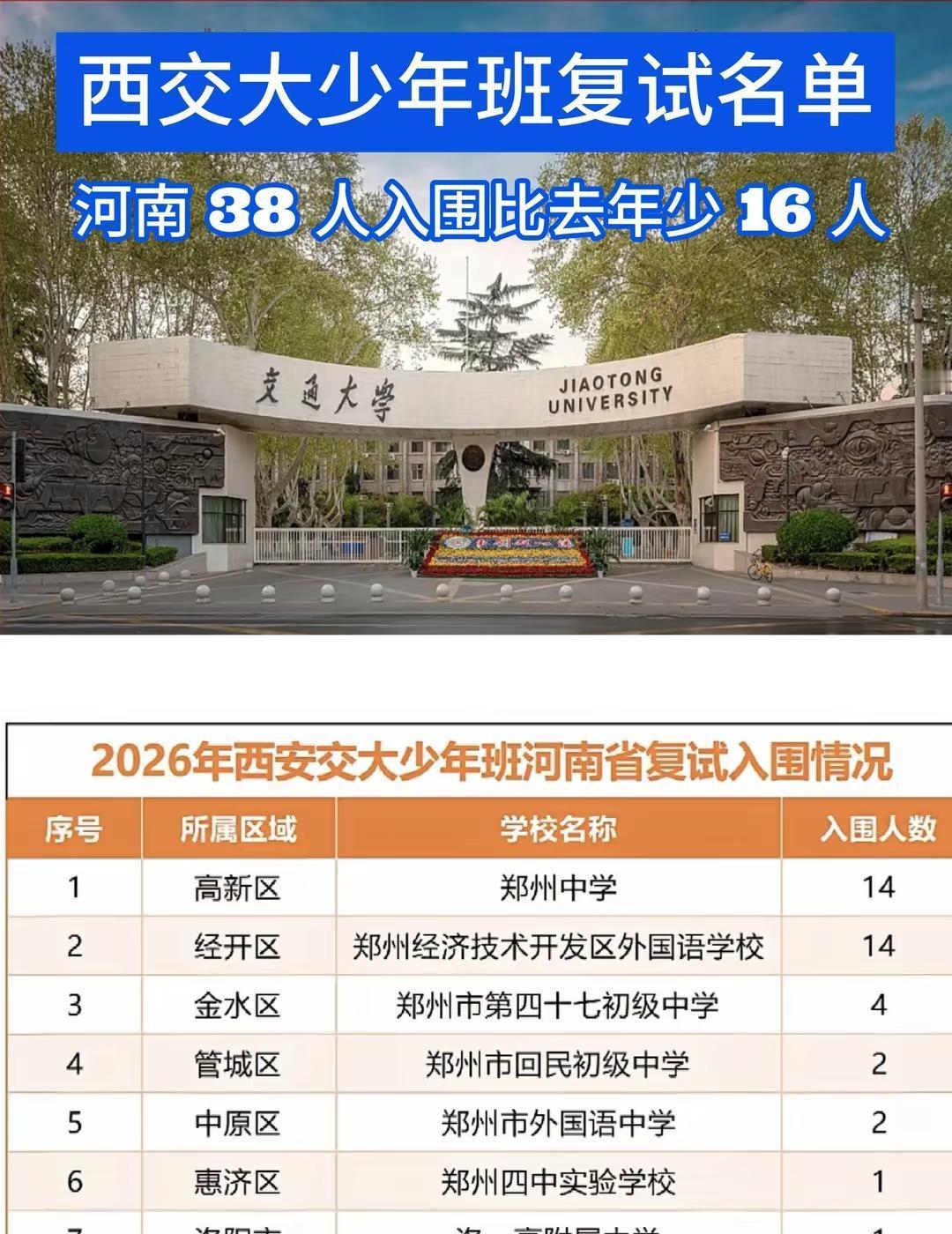 西交大少年班复试,河南 38 人入围 西交大少年班复试名单今日出炉, 河南省共有 38 人入围西交大少年班复试 从名单可以看出,37人来自郑州六所中学 其他地市只有一人,来自洛一高附属中学 ✅​河南省各学校进入西少班复试人数: 郑州中学 14人(优势不再很明显) 经开外国语学校 14人(迎头赶上) 郑州市四十七初级中学 4人 郑州市回民初级中学 2人 郑州市外国语中学 2人 郑州四中实验学校 1人(四中系唯一) 洛阳市一高附属中学 1人(地市唯一) ✅西安交通大学少年班 是中国仅有的三个少年班之一。 被录取即可“一考免三考” —免中考、高考、研究生考试, 预科班毕业合格直接获得硕士学位。 今年初中起点全国只录取60人 而且预科班统一在西交大附中上课 河南 多元升学途径 中小学 复试 择校 青少年发展 升学规划 青少年教育 西交大少年班