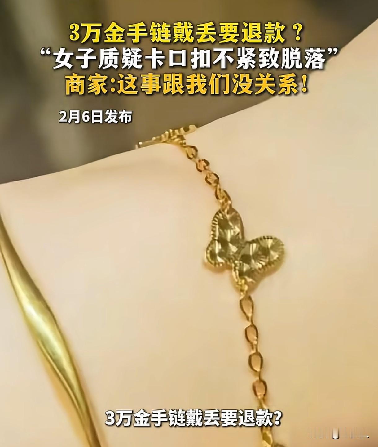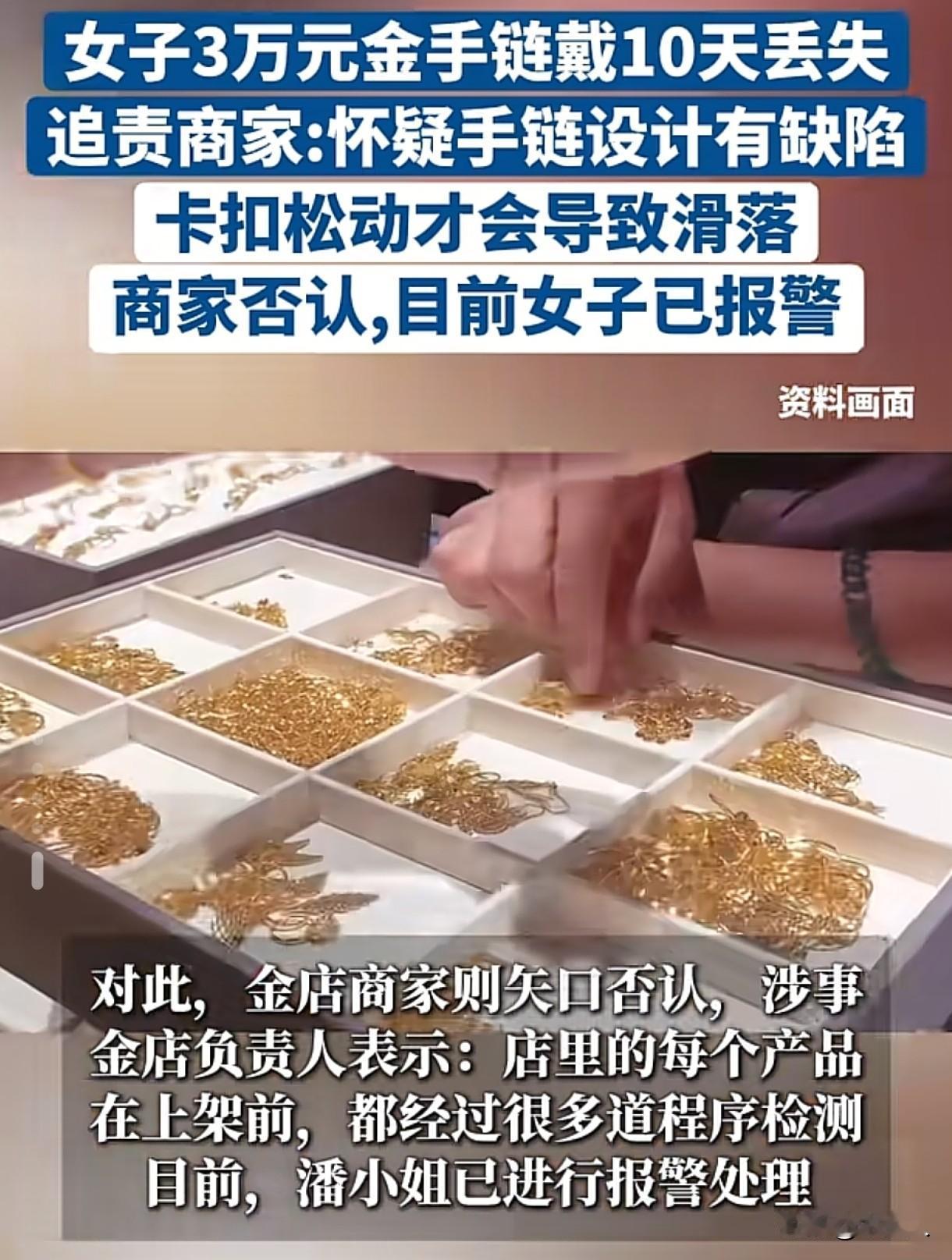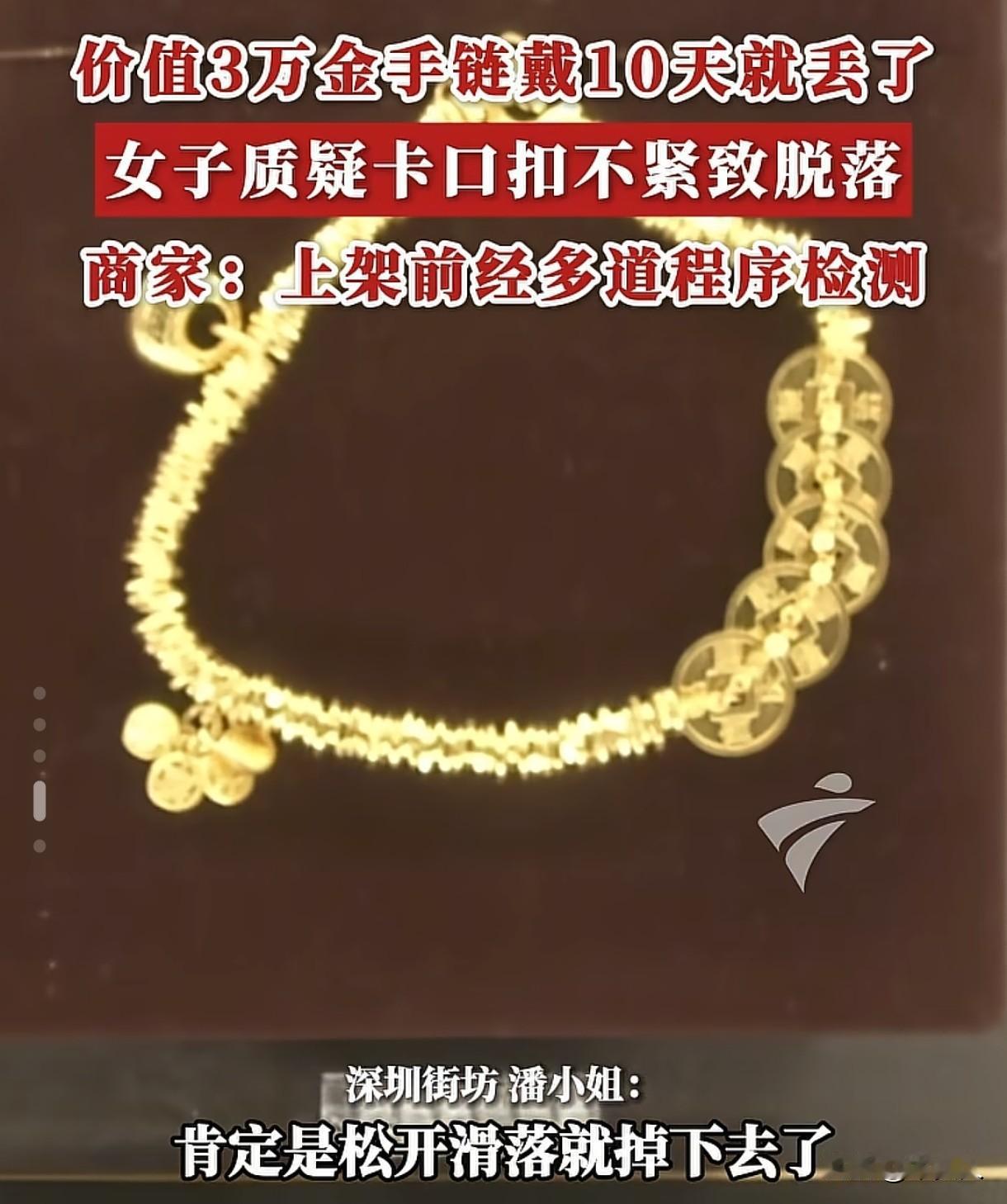 “还真是什么人都有啊!”广东深圳,女子花3万多买的黄金手链,戴了10天左右就掉了,女子认为是手链工艺有问题,卡口太短,扣不紧,要求商家退款,赔偿自己的损失。可商家的回复,气的女子直接报了警。网友:你怀疑卡扣有问题,别人还怀疑你藏起来了,这怎么追责? 潘小姐郁闷坏了,原本自己满心欢喜买来的金手链,还没佩戴几天就丢了,心里本来就来气,去找商家沟通,还碰了一鼻子的灰,换做谁,都会感觉憋屈的。 前不久,她去逛金店,一眼就相中了那条金手链,这条链子的款式很漂亮,自己戴起来很好看。 在店员的热情推荐下,潘小姐没有过多犹豫,爽快的付了31350元,买下了这条金手链。 刚戴上的时候,潘小姐心里别提多美了,可仅仅只过了10天左右,潘小姐就发现这条手链不知道什么时候滑落丢失了,滑落的时候她一点感觉都没有。 她到自己能找的地方都找过了,可连手链的影子都没有看到,这条手链就像凭空消失了一样。 冷静下来后,潘小姐越想越觉得不对劲,怀疑是手链的设计存在缺陷,卡扣位置太短,还是开口的,卡扣松动,手链悄无声息的滑落了。 她看着自己空空的手腕,心里又气又急,气的是自己花了这么多钱,却买了个这么不“靠谱”的东西,急的是这3万多可不是个小数目,就这么没了,实在让人难以接受。 带着满心的质疑和气愤,潘小姐找到了商家,说手链的卡扣设计是有问题的,要求商家退款给自己。 商家负责人却拒绝了潘小姐的无理要求:自己店里的每个产品在上架前,都是经过很多道程序严格检测的,质量绝对没有问题。 手链离柜后,客户是怎佩戴的,佩戴过程中发生了什么,他们是没有办法知道的,客户自己佩戴手链丢失,跟他们无关。 因这款手链店里也暂时没有货了,对于潘小姐反馈的卡扣问题,双方也没法验证。 潘小姐听了商家的回复后,觉得商家是在推卸责任,商品出了问题,商家却不管了,就这么轻易的把责任撇干净,她气的报了警,可目前暂无结果。 有网友说:这就是我不买金手链,而买镯子的原因,手链真的太容易滑落了,并且掉了,自己也是没感觉的。 也有人说:自己把手链丢了,就说是工艺问题,去找店家,那别人是不是可以反过来说,你把手链藏起来了,故意去讹钱,这种事情真说不清楚了,自认倒霉吧。 其实站在潘小姐的角度来说,她作为消费者,花3万多买条金项链,自然是期望得到质量可靠的商品的,可仅仅佩戴10天,手链就莫名其妙掉了,她怀疑产品本身设计存在缺陷,也是正常的。 经营者提供的商品或服务必须符合基本的质量要求,能够满足消费者的正常使用需求。 如果商家提供的商品质量存在问题,消费者是可以要求店家退、换货或者给予赔偿的。 《消费者权益保护法》第24条规定:经营者提供的商品或者服务不符合质量要求的,消费者可以依照国家规定、当事人约定退货,或者要求经营者履行更换、修理等义务。 潘小姐觉得手链丢失是因为产品质量问题,特别是卡扣松动这一设计缺陷导致的,那么需要提供证据来证明自己的主张,比如专业的质量检测报告等,证明手链在正常佩戴情况下因卡扣问题而滑落丢失,否则是很难认定金店需要承担赔偿责任。 如果潘小姐无法证明手链存在质量问题,那么她需要自行承担手链丢失的损失。 金店虽然称他们的产品经过了严格检测,质量是没有问题的,且手链离柜后的情况无法确认等。 为了打消顾客的疑惑,其实也可以拿出质量检测证明等,证明自己的产品是不存在设计缺陷或质量问题的,这样既能消除顾客的疑虑,也能维护自身品牌,大家皆大欢喜。 在佩戴贵重物品出门时,一定要仔细检查,是否佩戴正常,卡扣是否扣紧,以免财物丢失。 大家觉得,潘小姐还能要回自己的损失吗?如果是你,你会买金手镯还是金手链? 关注@木头人 ,从法律角度看世界,感受不一样的人情冷暖。