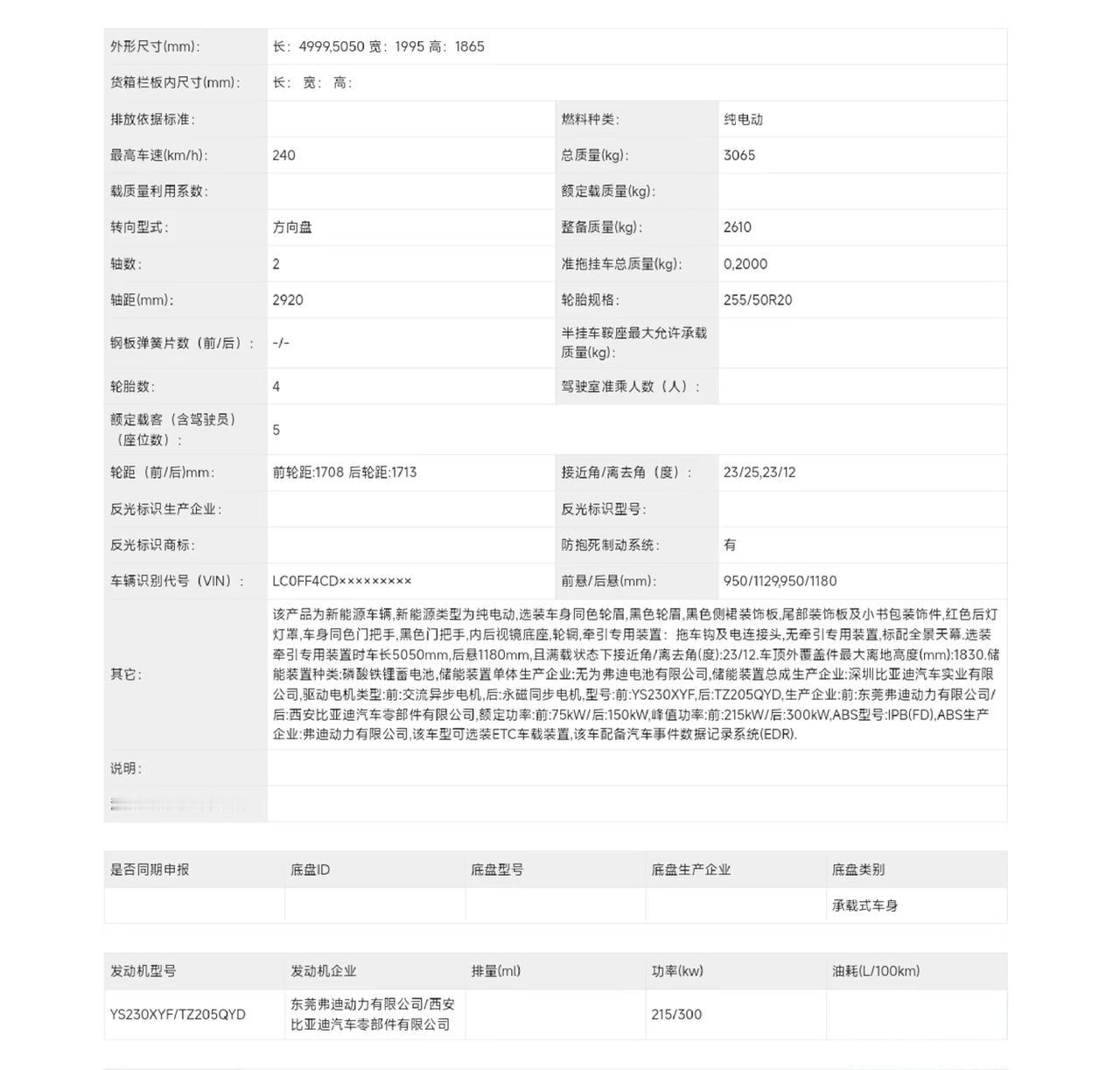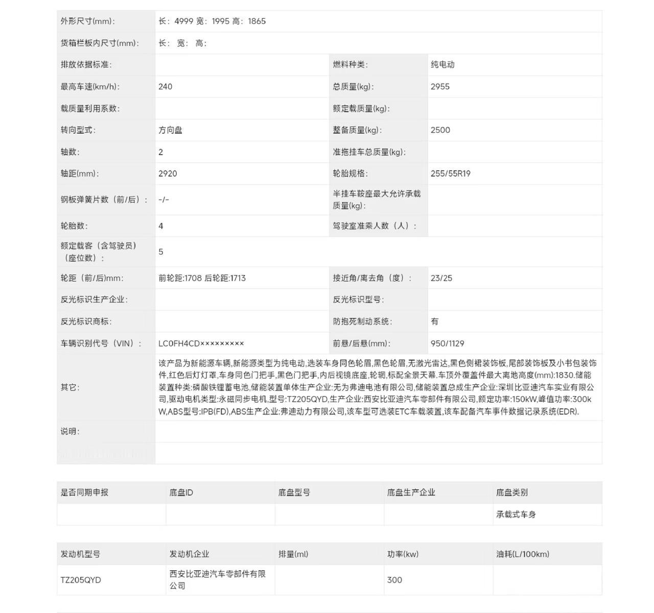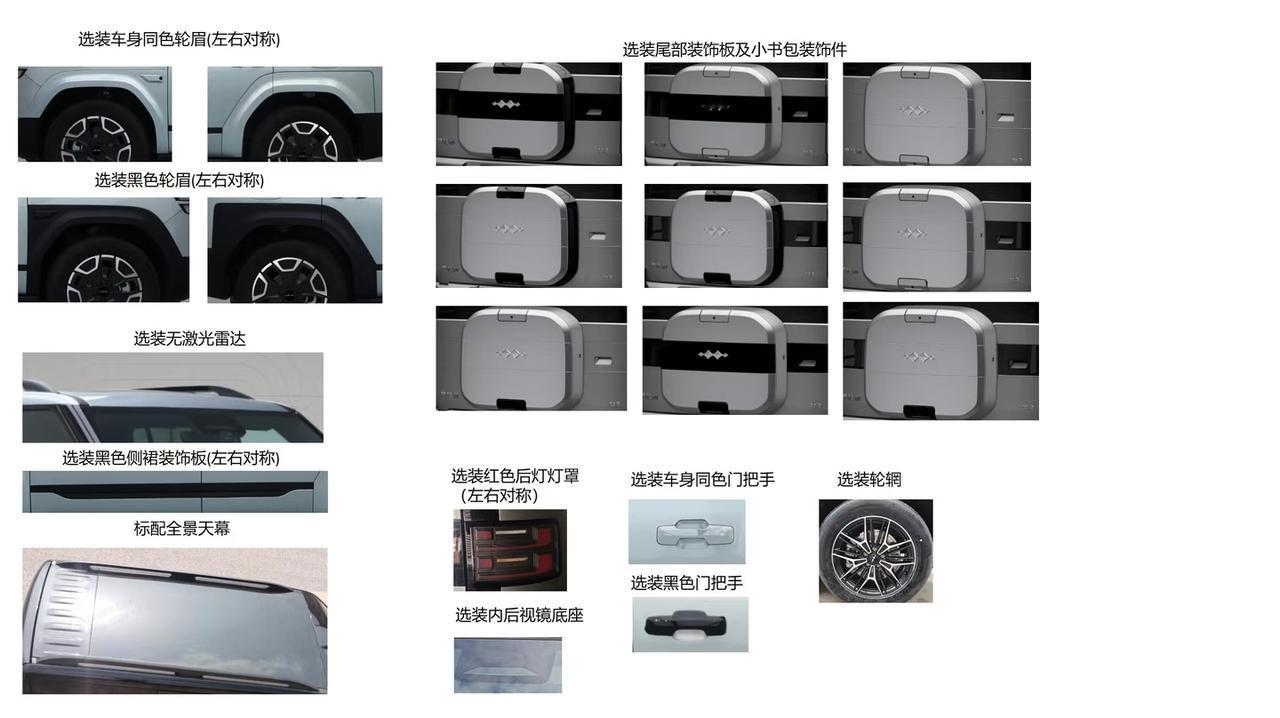 比亚迪方程豹钛7纯电版 申报图 外观上,前脸 封闭式纯黑 双层LED大灯,上面日行灯带,下面方形主灯。前保险杠外凸,银色H型装饰,独立雾灯。车顶有激光雷达。 侧面,平直腰线,悬浮车顶。D柱几何纹理装饰,传统门把手。19、20英寸轮毂可选,车身同色外扩轮眉,打孔通风刹车卡钳,有车顶行李架。 车尾,外挂储物箱,可拆卸,不是备胎。贯穿黑色饰条,双L型尾灯,尾标能发光。侧开电吸尾门。 车身尺寸,车长4999mm和5050mm,因为前后保险杠是选装 所以车长不同。 车宽1995mm,车高1865mm,轴距2920mm。 动力上,预计单电机和双电机。 单电机后驱,功率300kW,零百加速预计5.5秒。 双电机四驱,前电机215kW,后电机300kW,零百加速预计3.8秒,最高车速240km/h。 用的磷酸铁锂刀片电池,800V高压快充,10%到80%充电要15分钟。 配置上,预计标配激光雷达,支持城市NOA高阶驾驶辅助,预计15.6英寸旋转中控屏+鸿蒙车机系统。 预计可装拖车钩,最大拖挂重量1.5吨,预计可选麂皮内饰、环保再生面料内饰,预计座椅支持通风、加热、按摩功能。 最后,方程豹钛7纯电版的主要优点在:动力强、800V快充+激光雷达,经典造型。 短板:纯电+硬派造型 风阻大,高速和冬季续航打折多。 无机械锁、无硬核底盘升降(申报信息无云辇高阶悬架),极限越野能力不如燃油、插混硬派,偏城市越野。 外挂储物箱里面不是备胎,长途自驾需自备备胎。