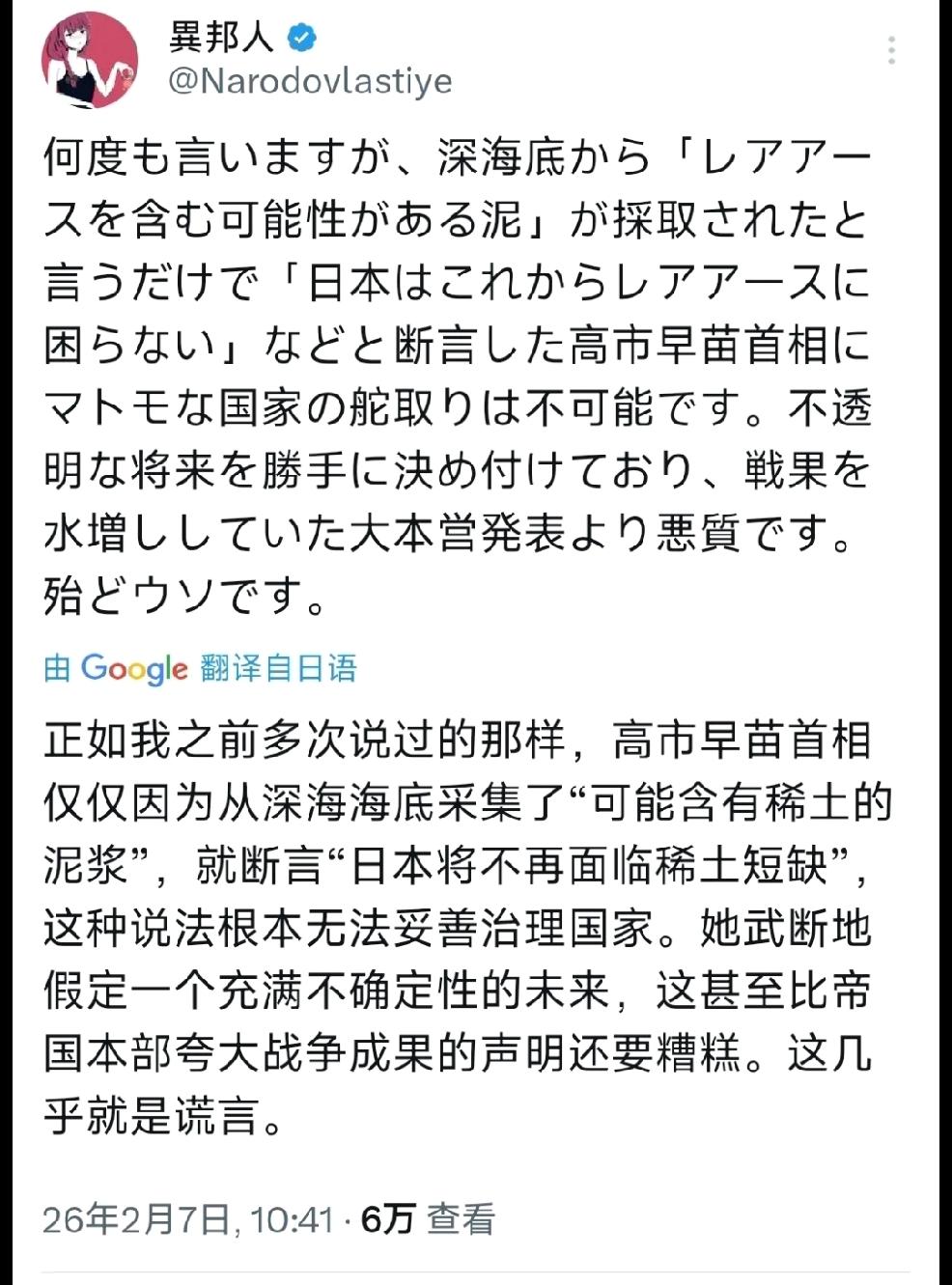 2月7日,日本个人媒体-異邦人-发文:“正如我之前多次说过的那样,高市早苗首相仅仅因为从深海海底采集了可能含有稀土的泥浆,就断言日本将不再面临稀土短缺,这种说法根本无法妥善治理国家。她武断的假设一个充满不确定性的未来,这甚至比帝国本部夸大战争成果的声明还有糟糕,这几乎就是谎言。” 个人认为:这样一个对外献媚,对内表演,满嘴谎话的只会作秀的职业女政客,领导日本正合适,正当时而且不要忘记,这是当下整体日本人大多数的选择结果。
