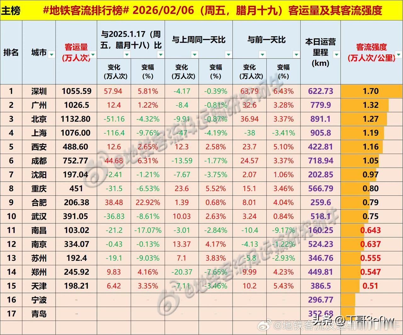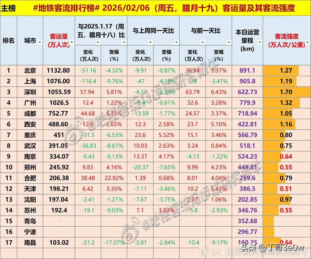 周五北京地铁客流量1132万人次以上,全国排名第一[呲牙][呲牙][呲牙] 爆料 身边事 中国地铁客流日报 昨日客流 排行榜 周五 北京 2026年2月6日 星期⑤ 全国重点城市轨道交通客流量排行榜: 北京:1132.80万 上海:1076.00万 深圳:1055.59万深圳身边事 广州:1026.50万广州身边事 成都:752.77万 西安:488.60万西安爆料 重庆:451.00万重庆身边事 武汉:391.05万武汉地铁 南京:333.90万 郑州:245.92万 合肥:206.38万合肥地铁 天津:198.21万天津地铁 沈阳:197.04万 苏州:192.40万苏州爆料 青岛:103+万青岛身边事 宁波:103万+宁波地铁 南昌:103.02万