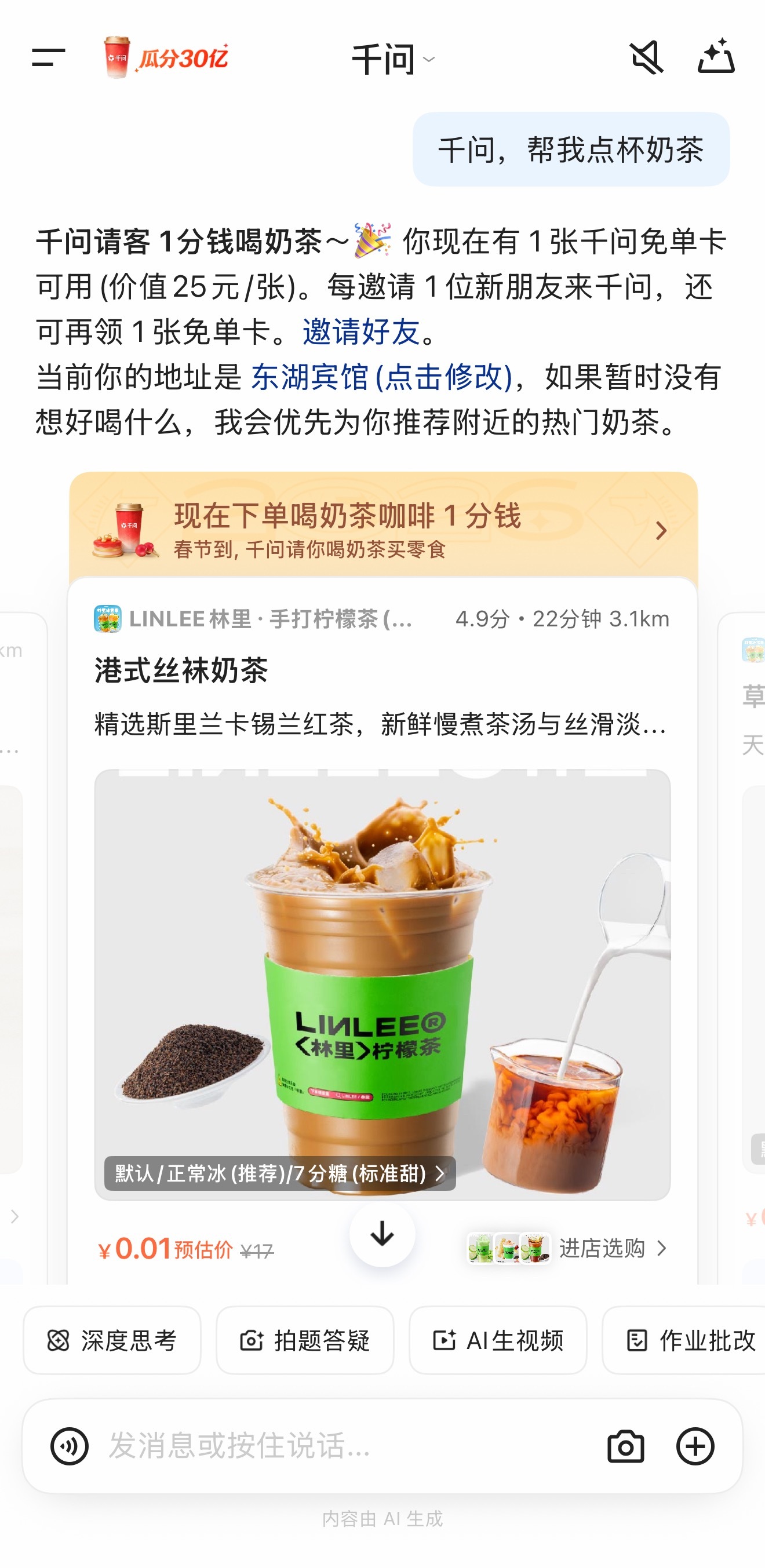 哇呜!千问这波春节福利太香了!30亿请客全国吃喝玩乐,白嫖的奶茶和盒马生鲜必需是