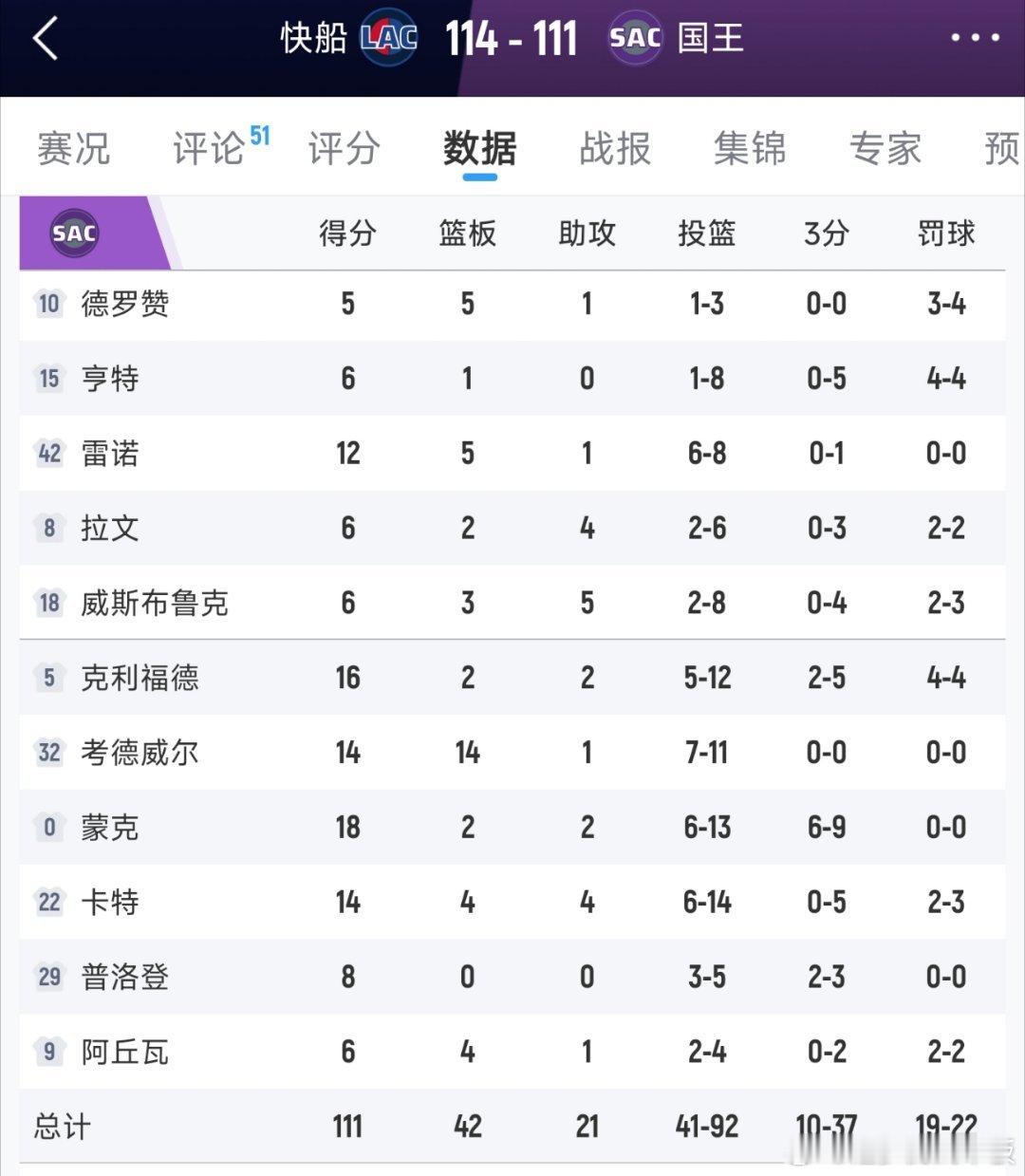 国王吞下11连败,继续排名联盟垫底。拉文&威少&亨特各得6分,德罗赞5分快船vs国王