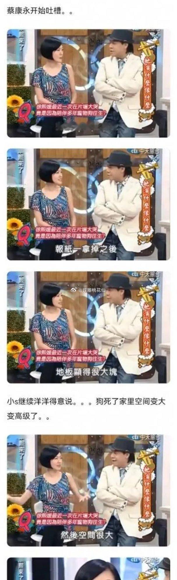 从小S和S妈对大S最宝贝的宠物狗五妹娘的态度就能看出来,她们这人有点淡漠。那小狗一直待的地方空了,正常人都会觉得心里空落落的,满是物是人非的惆怅吧?哪会觉得一下子变高级、变干净了啊……别说是节目效果开玩笑,真不是那么回事。就像大S回怼的那样,这事儿根本没法当玩笑看。