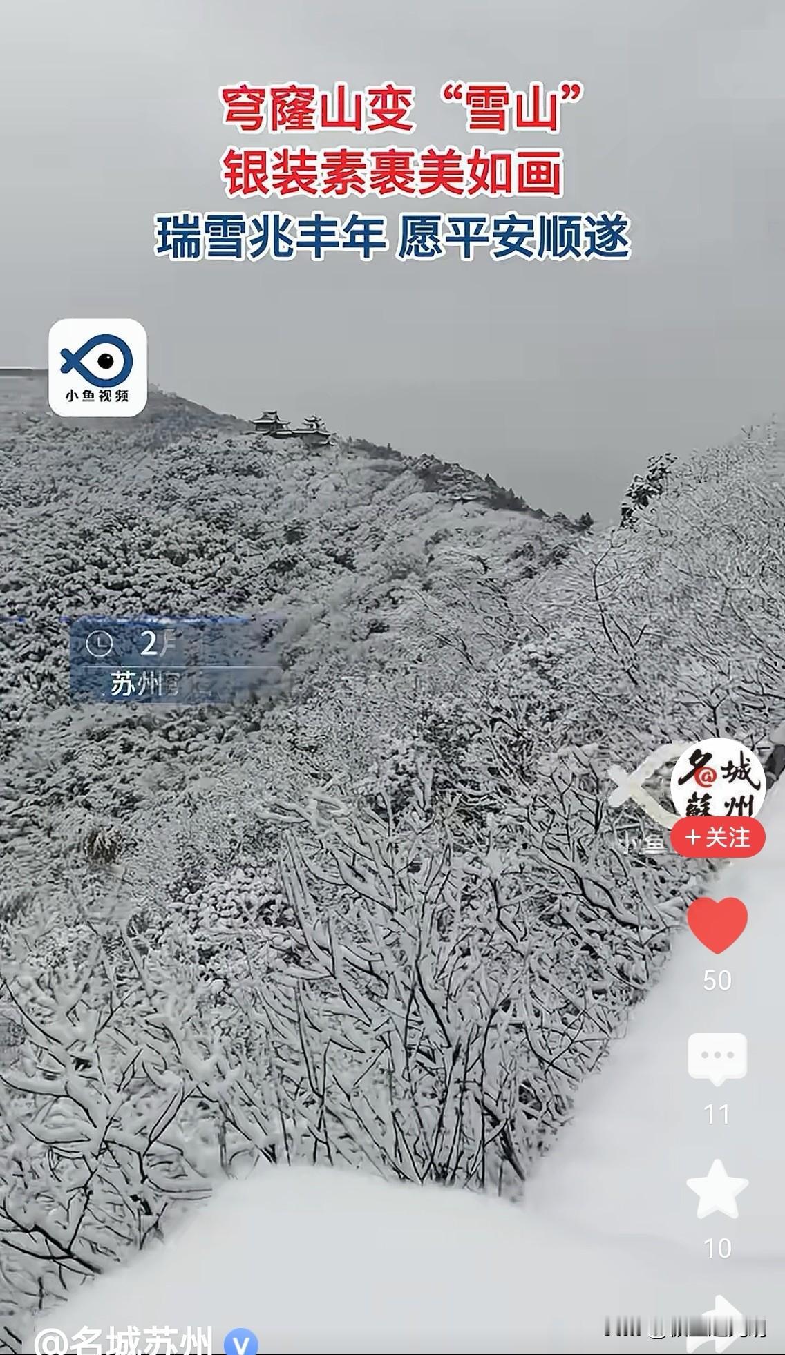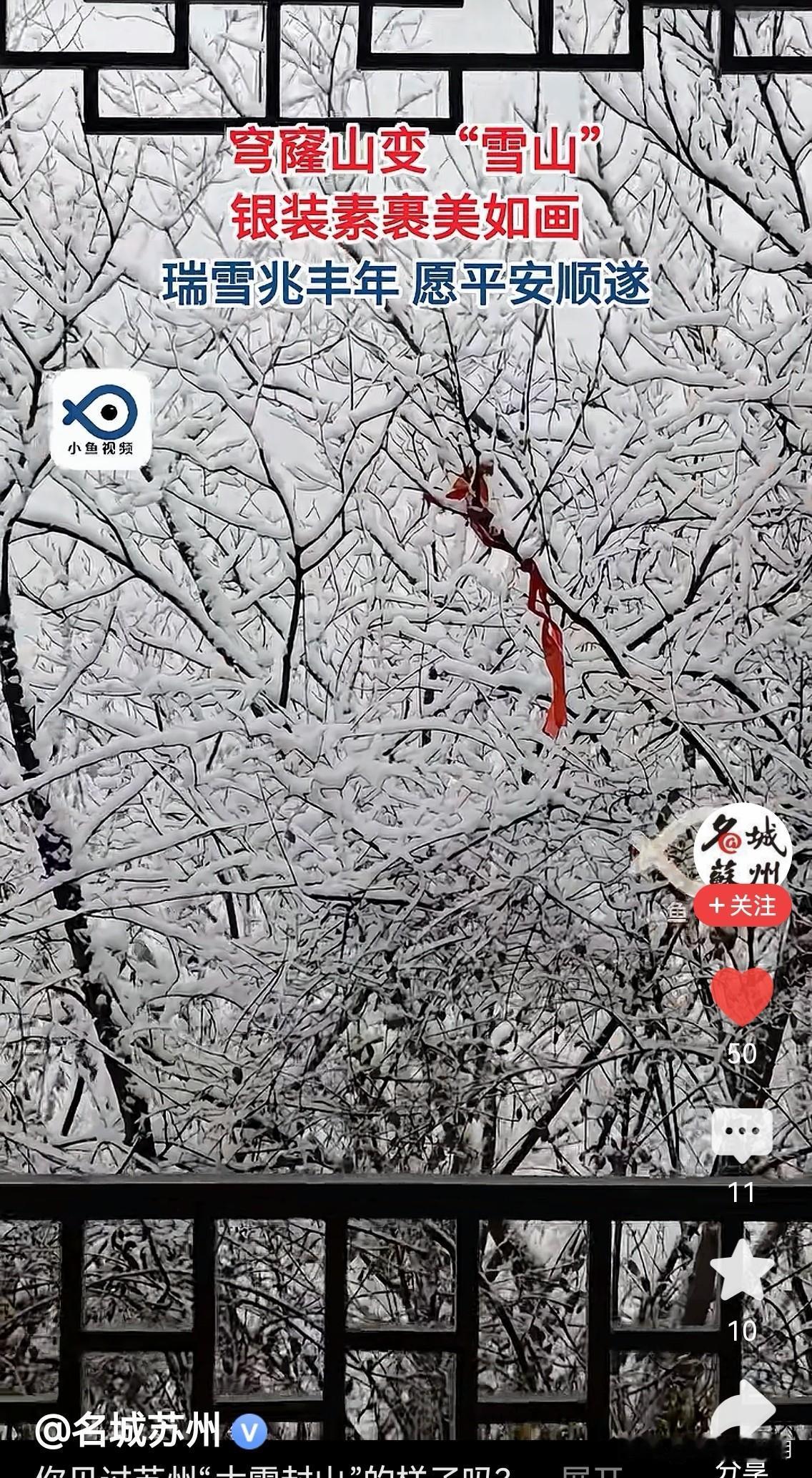 雪下哪儿去了 今早看到一个视频,苏州的雪都下哪儿去了,原来都落到穹窿山去了,城市里没有看到雪。 博主的视频拍得非常好,粉妆玉砌,琼楼玉宇,银妆素裹,枝条上都是雪,红灯笼上也被雪覆盖了,想不到是置身江南,以为到了东北。 这个时候如有兴致,去登山赏雪不错,地面不滑,并没有存雪,尽可欣赏山景雪景。 前天天气预报就有寒潮预警,6日苏浙皖将有大面积暴雨雪。早上看地面已经湿了,全天基本雨未停。妹妹喊老母亲过去吃饭,也被我打岔,让她改日吧,傍晚还要下大雨,往返得20多公里。 买的杜鹃花到了,想等雨停再去拿,好像一直等不到,最后还是顶着雨打着伞,去把花拿了回来。拆开看,店家很仔细,把枝叶花朵都用一个绒线毯包裹好,还送了一包肥料。 找着空盆,将花移栽进去,肥料也埋在根下。这种花养过几次,不是很好养,水过多过少都不行。但红红的花骨朵儿非常喜庆,把花挪在空调出风口下,此处温度最高,希望它能早点扎下根,随遇而安活下来。 傍晚再出门去给老母亲买药,雨已经下得很大,这个时候透过灯光,能看到雨里夹着大片的雪花,不过落到地上就无影无踪。 找了两家药店,只找着相近的。老母亲说在老家的药店买的药有用,应该是抗生素用得多,药劲过猛,在这儿给她买的中成药缓和一些,就不起作用了,只有再买西药。 回到家关上门,把风雨雪和一袭寒意都关到了门外。 今早天慢慢转晴,太阳出来了,温度很低,是雪后晴冷的感觉。如果要看雪,就要驱车几十公里去山里看了。苏州最美的风景在哪里