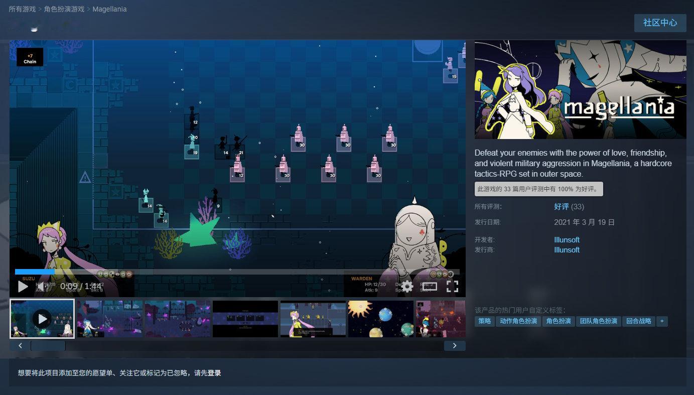【Steam喜加一】回合策略RPG《Magellania》已可在Steam免费领取,原价37元,2月10日凌晨2点截止,暂无官方中文,好评率为100%,收录33篇玩家评测。