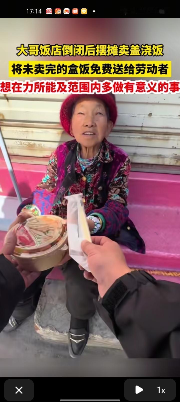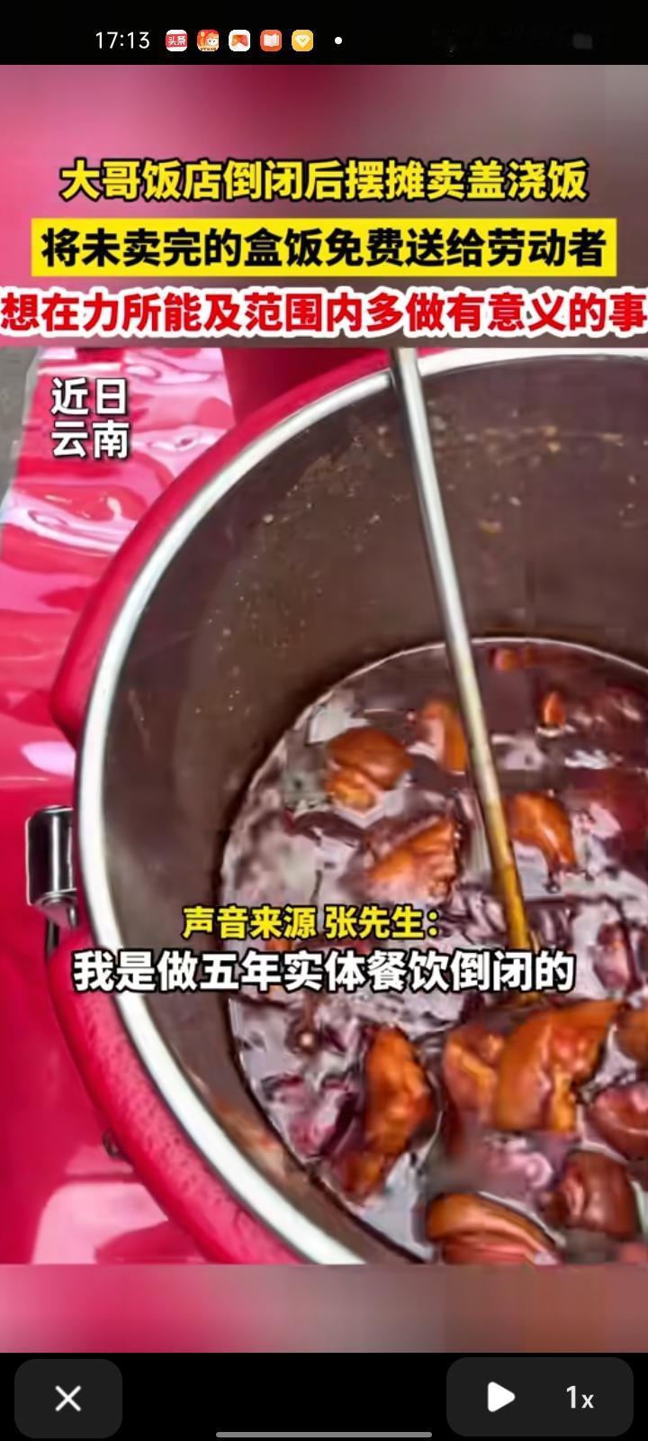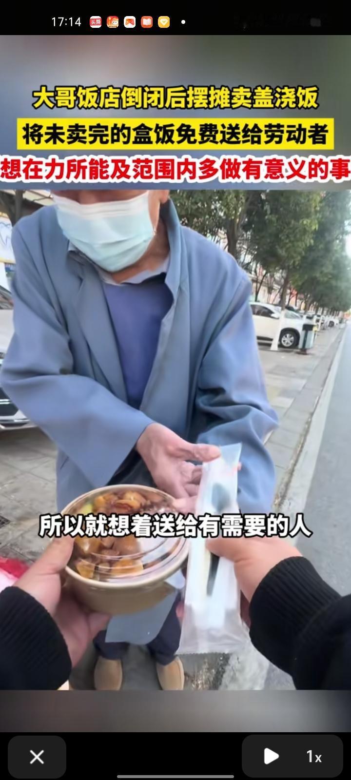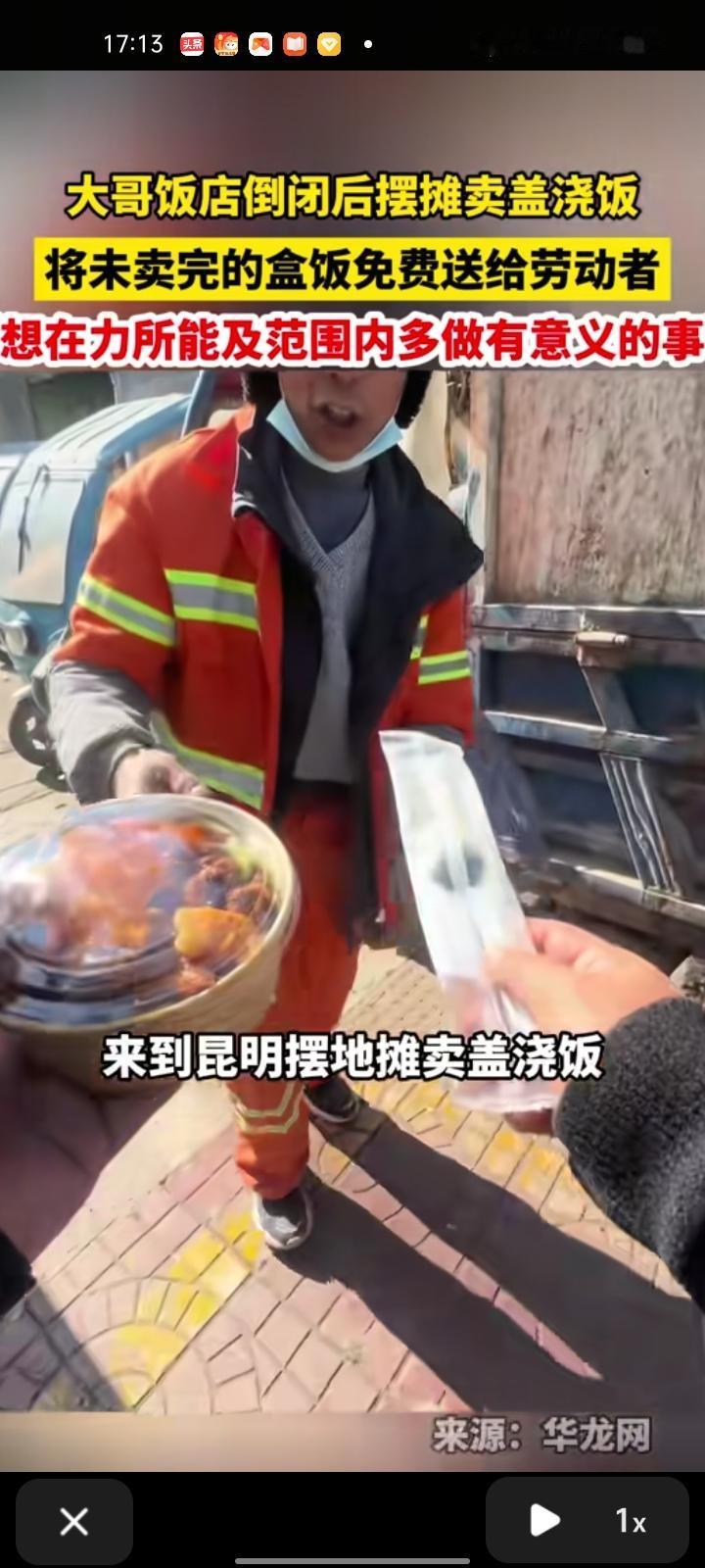 近日,云南昆明。来自四川的张先生是开饭店的,在饭店经营了五年就倒闭了,一人来到昆明摆摊卖盖浇饭,出摊卖不完的免费送给劳动者,在力所能及的范围做出有意义的事。 这场景和玉杰妈妈有点相似,我记得她是蓝鼎星河府开早餐店,摆摊卖老面小笼包和糯米饭团的,干了差不多五个月就倒闭了