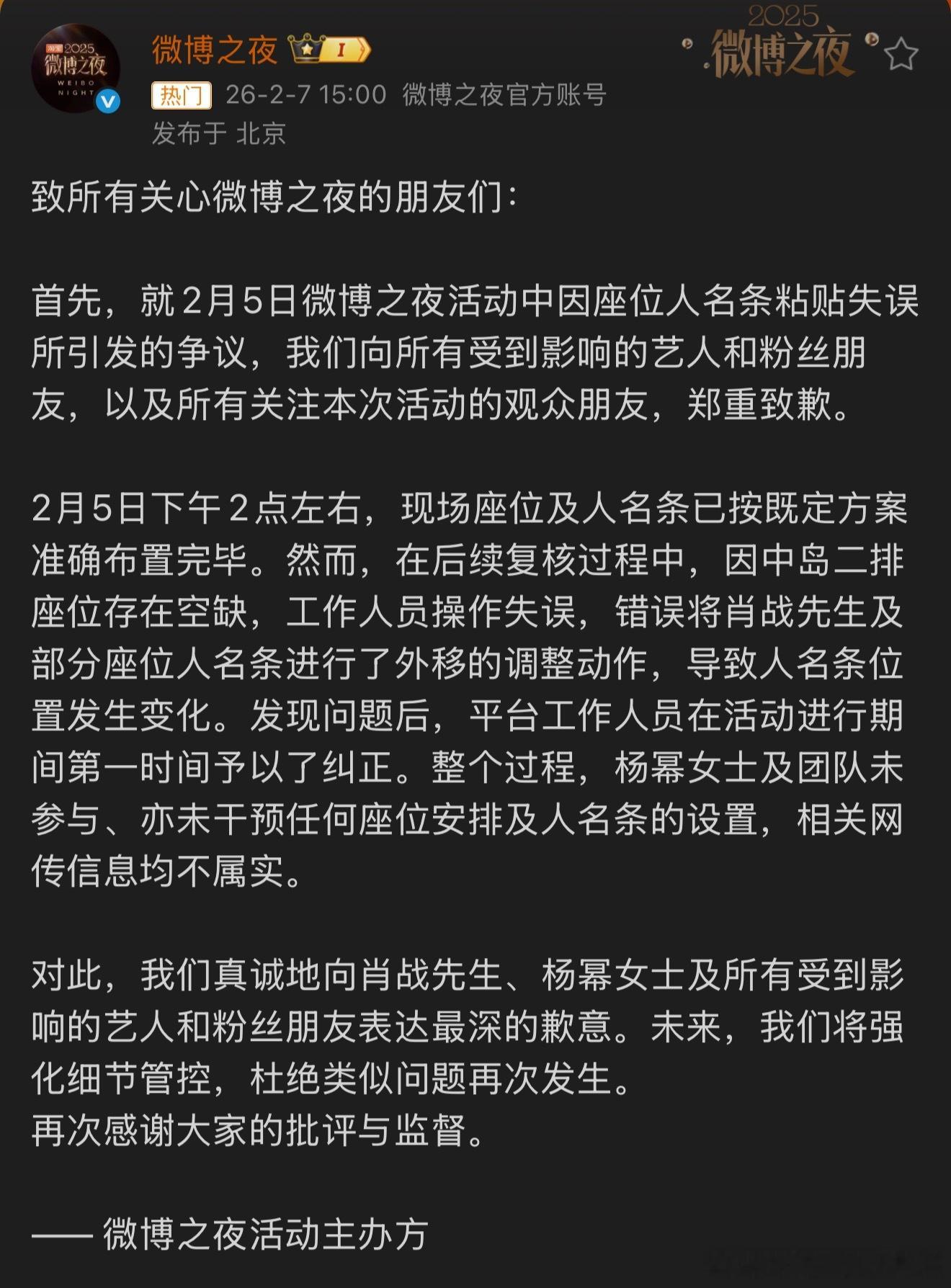 微博之夜声明 1️⃣肖战位置确实被移动了2️⃣“整个过程,杨幂女士及团队未参与、亦未干预任何座位安排及人名条的设置,相关网传信息均不属实。”