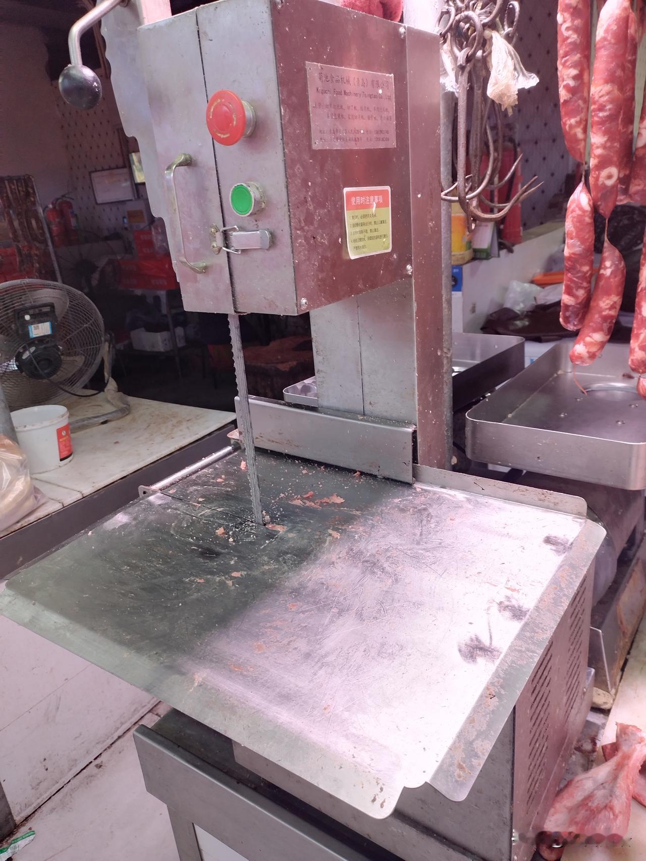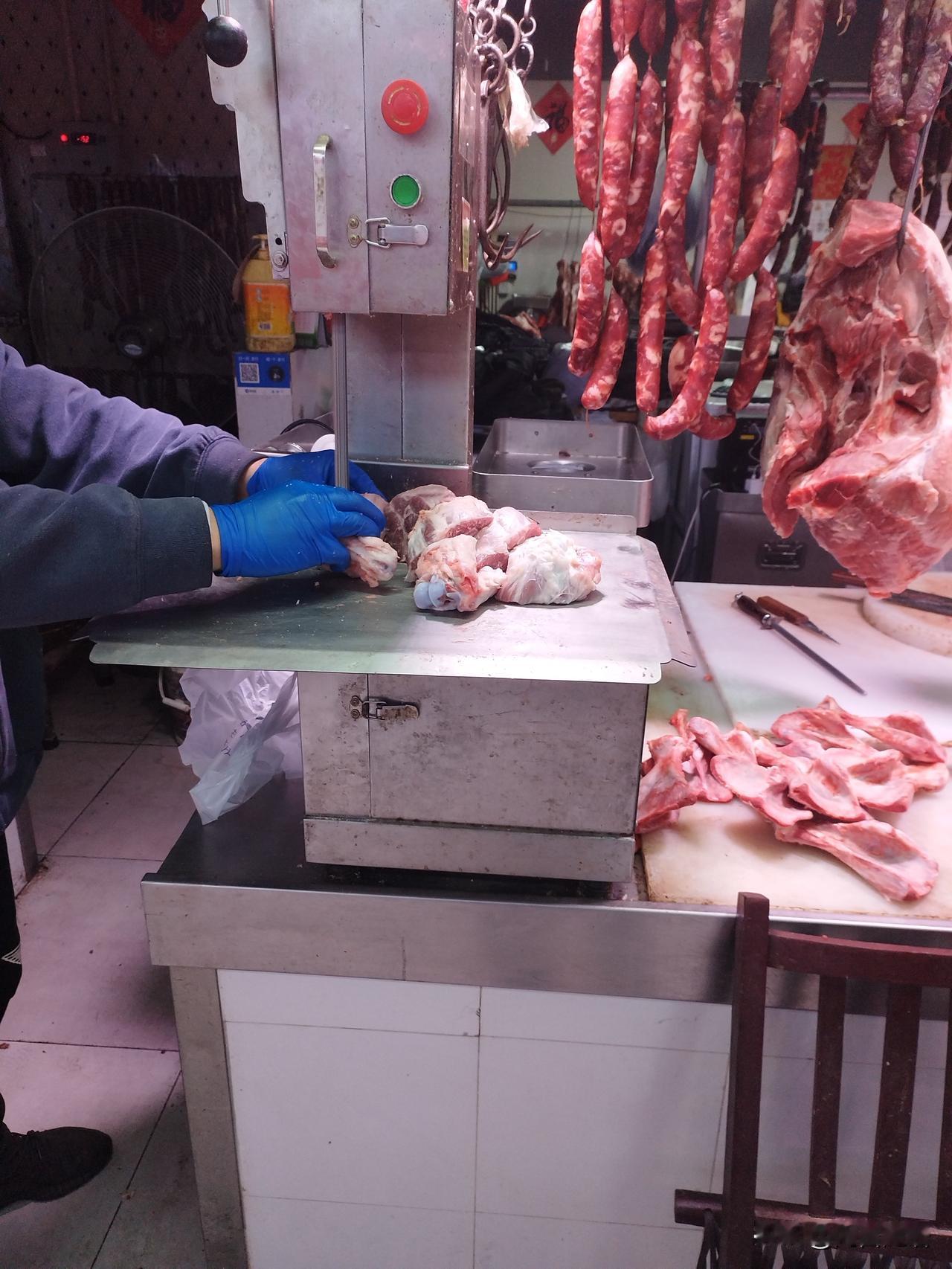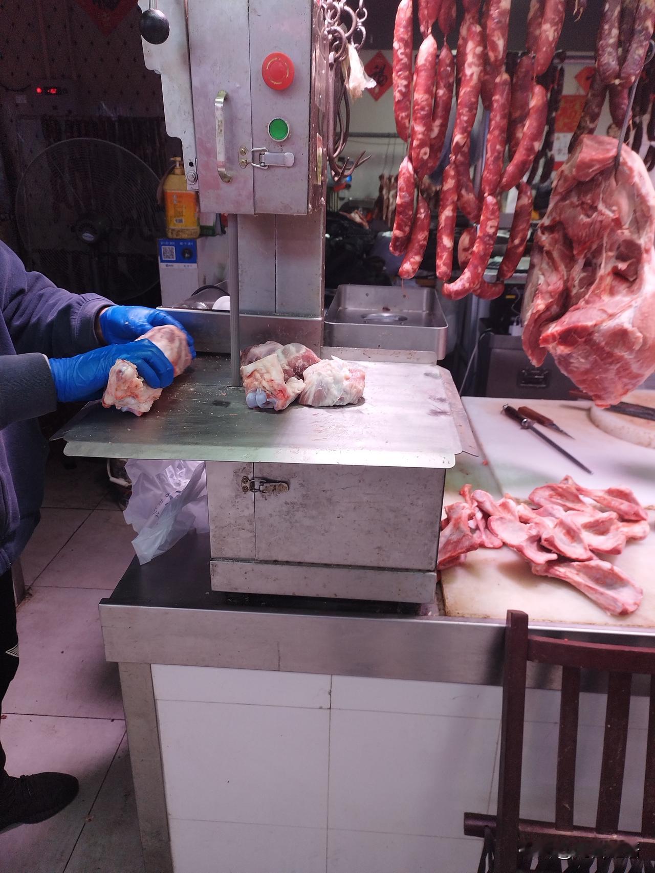 我还纳闷呢,只见老板拿着大骨头走向一台机器,就像一个竖着的电锯。 当他接通电源,听到声音时,我明白了,原来真的是电锯,只见老板两手抓着骨头两端,对着电锯往前一推,没有丝毫的停滞,就像切豆腐一般的丝滑! 这也太方便了,轻轻松松就搞定,科技让生活更便利,此言不假!