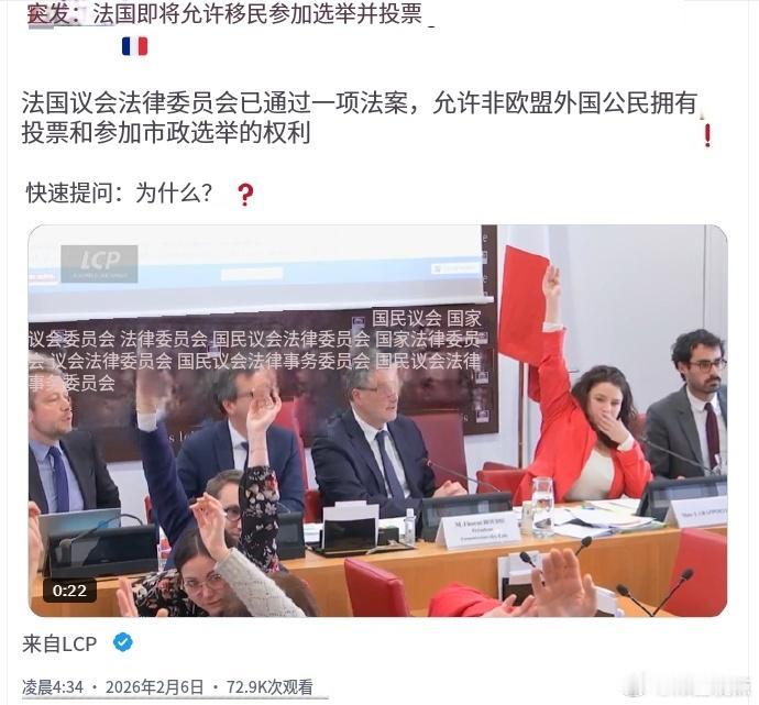 法国更进一步了! 法国议会法律委员会已通过一项法案, 允许非欧盟外国公民拥有投票和参加市政选举的权利! 最后的闸门即将打开了!