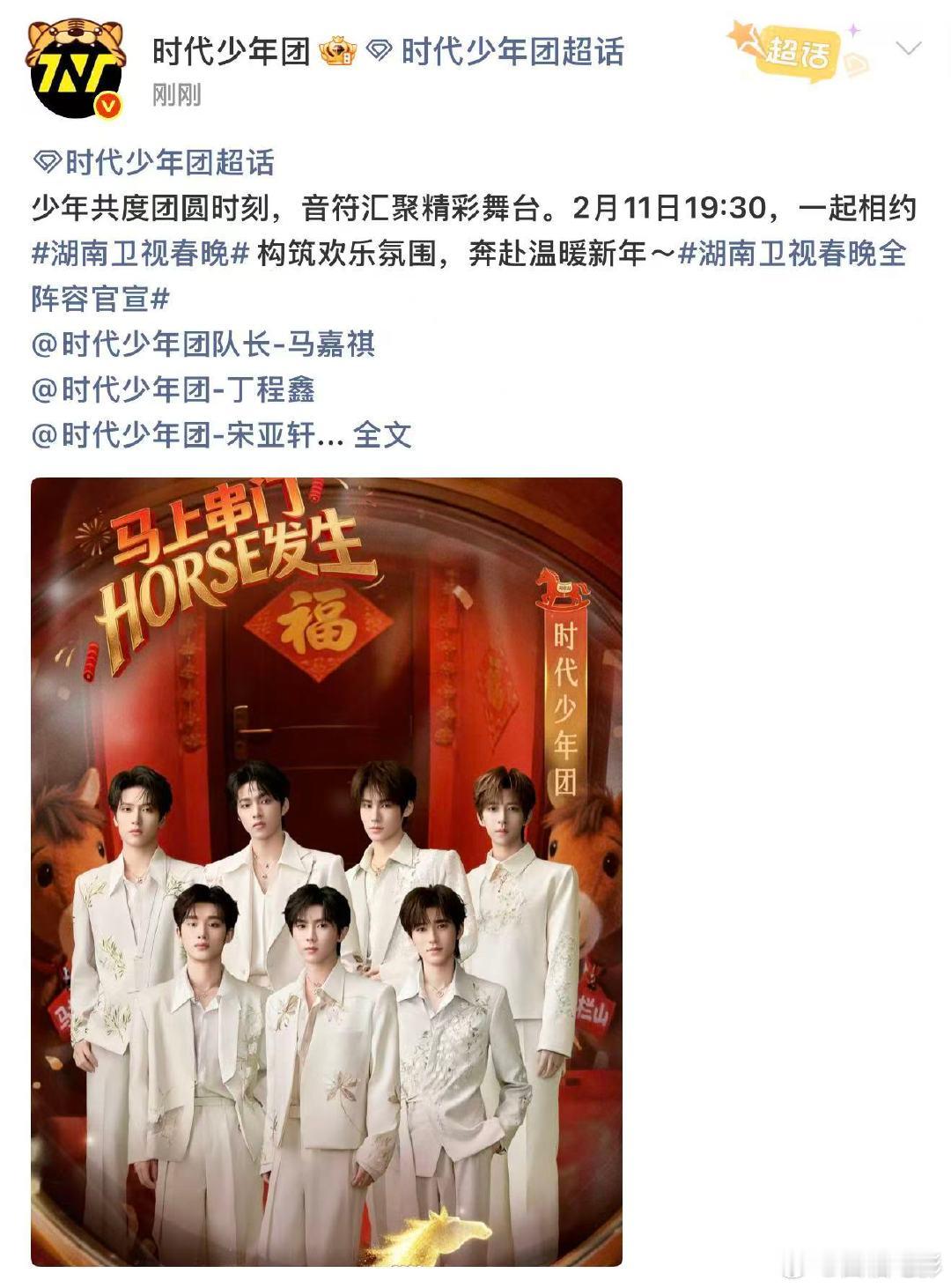 时代少年团官宣双卫视春晚时代少年团官宣北京湖南双卫视春晚2月7日,官宣北京台春