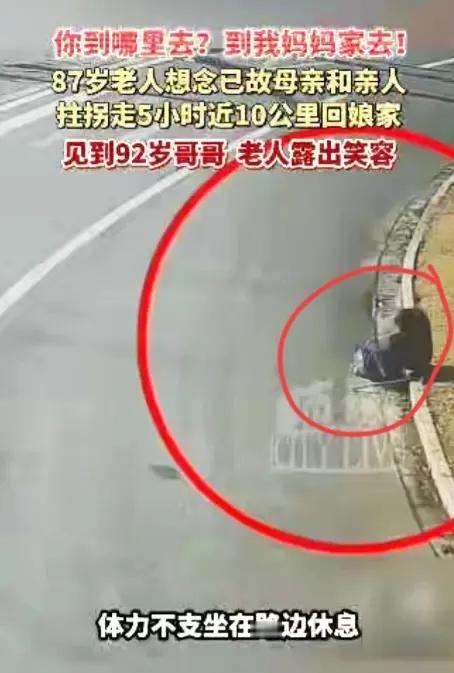 87岁高龄的江苏曹奶奶,凌晨五点多钟悄悄出门,徒步了十公里回了娘家。 回来路上被路过的司机捡到,司机把她带回了家,还让她吃了早饭。 原来曹奶奶回娘家只是说了一句“我想妈妈了”。她不想麻烦儿孙,也不想坐车去,想着自己能走就自己去。 曹奶奶的哥是92岁高龄的老爷子了,也许是心里话想说也说不清楚的了。越岁月的执念,更护着这份纯粹的亲情。 其实娘家从不是一栋房子,而是不管走多远都能奔赴的港湾,是有哥哥在就永远有人疼的底气,是哪怕妈妈不在了,也能找到童年温度的地方。 曹奶奶走了十公里,差点走晕了,坐在国道边上休息,民警赶到了现场。 民警带着曹奶奶回到家,看到曹奶奶的儿孙都在忙着做饭,也让民警吃了饭。民警才离开。 曹奶奶的故事告诉我们,不管年纪多大,对妈妈永远都是挂念的。 民警也是暖暖的,让人感动。 麻烦各位看官老爷们右上角点击一下“关注”,既方便您进行讨论和分享,又能给您带来不一样的参与感,感谢您的支持!