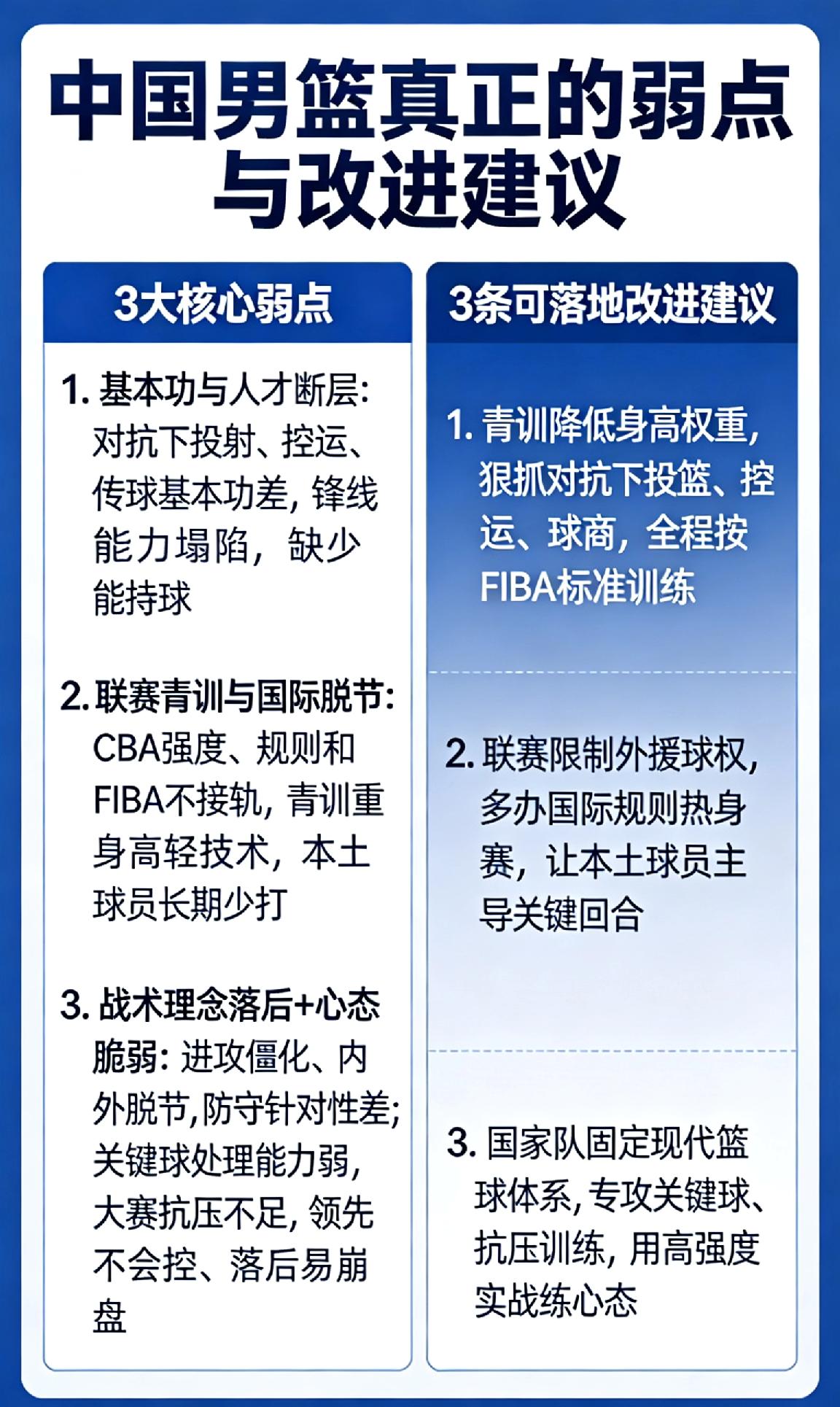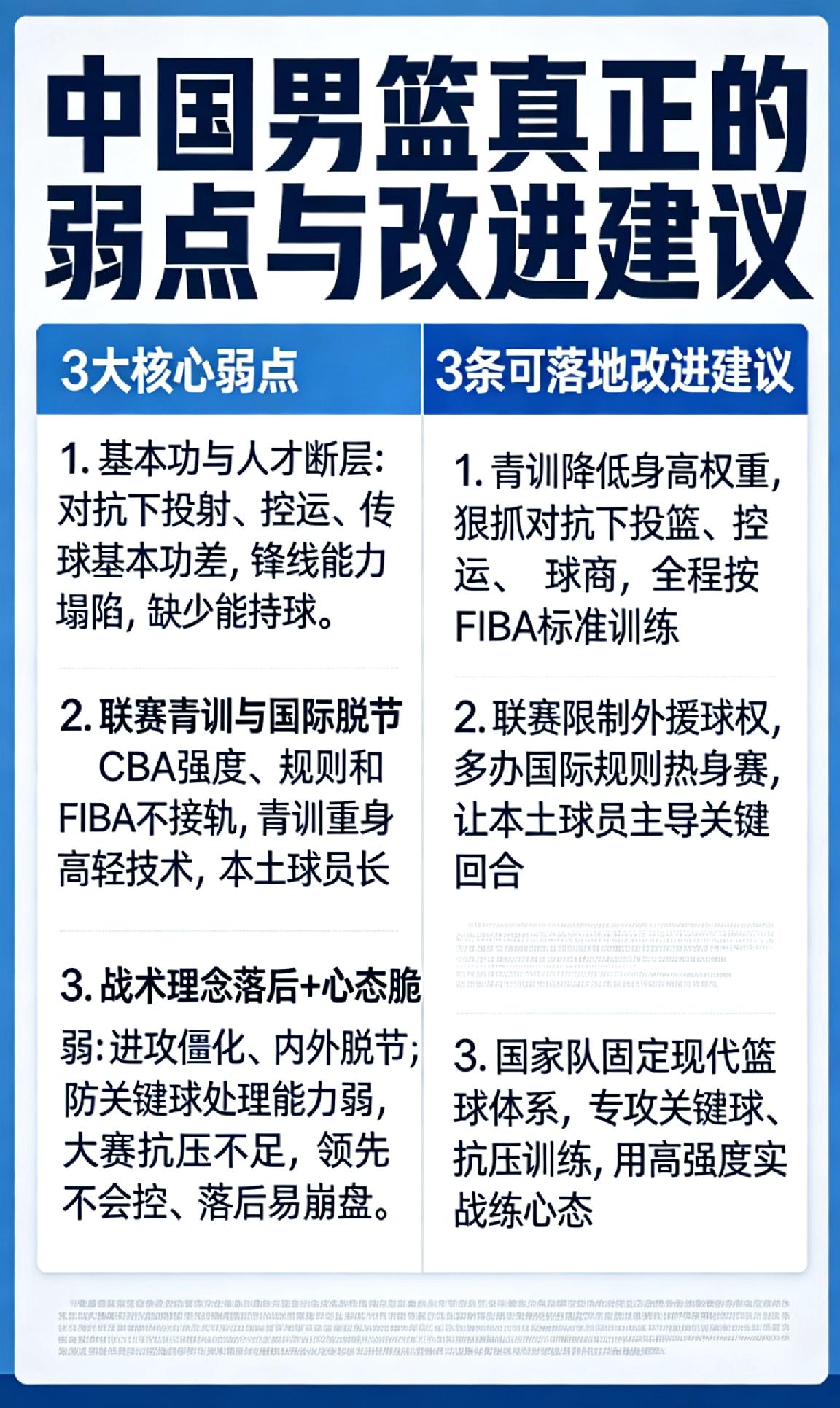1. 基本功与人才断层 对抗下投射、控运、传球基本功差,锋线能力塌陷,缺少能持球、能投篮的全能球员,核心位置青黄不接。 ​ 2. 联赛青训与国际脱节 CBA强度、规则和FIBA不接轨,青训重身高轻技术,本土球员长期少打高压硬仗,到国际赛场水土不服。 ​ 3. 战术理念落后+心态脆弱 进攻僵化、内外脱节,防守针对性差;关键球处理能力弱,大赛抗压不足,领先不会控、落后易崩盘。   二、3条可落地改进建议 1. 青训降低身高权重,狠抓对抗下投篮、控运、球商,全程按FIBA标准训练。 ​ 2. 联赛限制外援球权,多办国际规则热身赛,让本土球员主导关键回合。 ​ 3. 国家队固定现代篮球体系,专攻关键球、抗压训练,用高强度实战练心态。   中国男篮 男篮问题分析