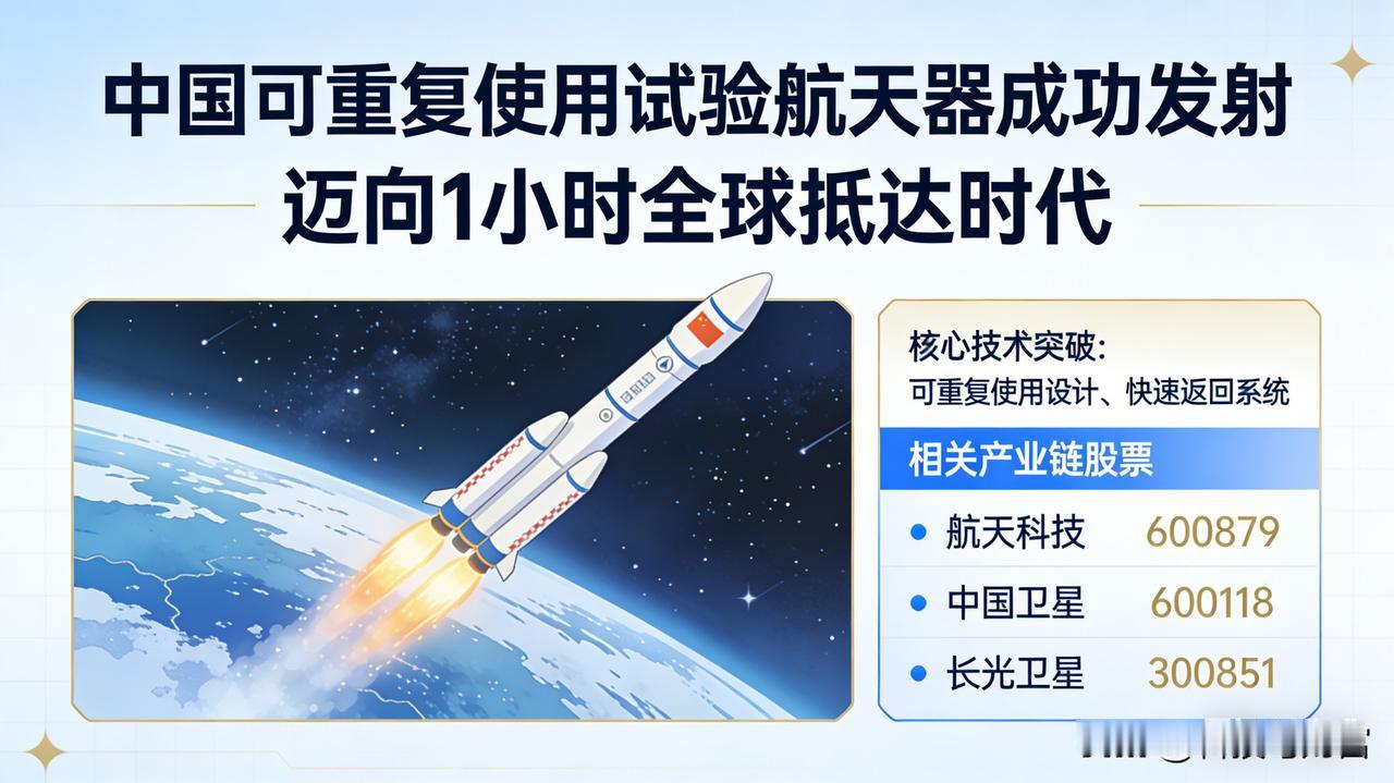 祝贺,驭箭凌霄,中国可复用航天器开启1小时全球抵达新时代 2026年2月7日,中国在酒泉卫星发射中心用长征二号F成功发射可重复使用试验航天器,开启在轨技术验证,推动低成本天地往返与“1小时全球抵达”能力建设,商业航天产业化提速。以下为核心消息与产业链股票梳理。 一、核心消息速览 • 意义:标志中国迈入轨道级可重复使用工程验证阶段,发射成本有望降70%-90%,支撑卫星组网、太空旅游、在轨服务等规模化发展,加速“1小时全球抵达”进程。 • 技术:采用垂直发射-水平着陆路线,主动防热技术可将再入温度控制在600°C以下,目标重复使用率99%。 二、产业链核心标的(按环节) 1. 总装与系统研制 • 中国卫星(600118):小卫星研制龙头,发射成本下降带动卫星需求,受益在轨服务与星座扩张。 • 航天电子(600879):箭载计算机、惯性导航核心供应商,可回收火箭捕获臂研发制造,适配回收控制。 2. 动力系统 • 航天动力(600343):液体火箭发动机龙头,掌握多次启动、变推力技术,对标SpaceX梅林发动机,为复用核心。 • 应流股份(603308):涡轮泵壳体、燃烧室机匣国产主力,供应推力室高强高导铜合金部件。 3. 热防护与材料 • 光启技术(002625):超材料隐身与热防护,适配再入高温环境,提升复用可靠性。 • 光威复材(300699):航天级碳纤维,支撑箭体轻量化与结构强度需求。 • 西部材料(002149):铌合金用于发动机热端部件,耐温2200°C,钛合金栅格舵市占率60%。 4. 回收与着陆系统 • 航天环宇(688523):国内唯一可复用着陆腿量产企业,订单弹性大。 • 巨力索具(002342):可量产火箭回收捕获臂,提供核心捕获装置。 5. 测控与通信 • 中国卫通(601698):天基测控通信龙头,为航天器回收提供全球覆盖高轨通信支持。 • 海兰信(300065):中标海上回收测控船,保障火箭海上回收关键环节。 6. 精密制造与3D打印 • 铂力特(688333):金属3D打印龙头,航天专用材料打印工艺领先,配套毛利率超40%。 • 斯瑞新材(688102):高强铜合金与高温合金部件,适配发动机热端,对标国际水平。 三、投资要点 • 主线逻辑:降本增效驱动商业化加速,复用技术成熟后发射成本显著降低,带动全产业链从验证走向量产。 • 重点方向:优先关注动力系统(航天动力)、回收系统(航天环宇、巨力索具)、热防护材料(光启技术、西部材料),其次是卫星应用(中国卫星、中国卫通)与精密制造(铂力特)。