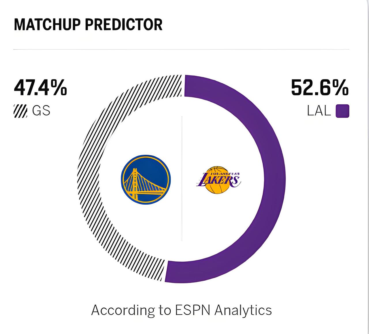 湖勇大战,库里缺阵,勇士胜率高达%47.4,貌似有点不把湖人放在眼里! 明天上午九点半,NBA迎来一场焦点战,湖人主场迎战勇士。排名来看,主队湖人31胜19负位居西部第五位,客队勇士28胜24负排名第八。 状态上勇士近三场两负一胜,而湖人近4场取得了三场比赛的胜利,状态可谓是爆棚。两队之前的两场比赛,一胜一负,平分秋色。 据悉,明天同湖人的比赛,勇士当家球星库里缺阵。即使如此,ESPN依然看好勇士,他们的胜率高达47.4%,赢球率接近一半。不知道大家注意到没有,每次关于勇士的预测,这家媒体都非常看好他们。不过往往事与愿违,勇士有时候不太给力。