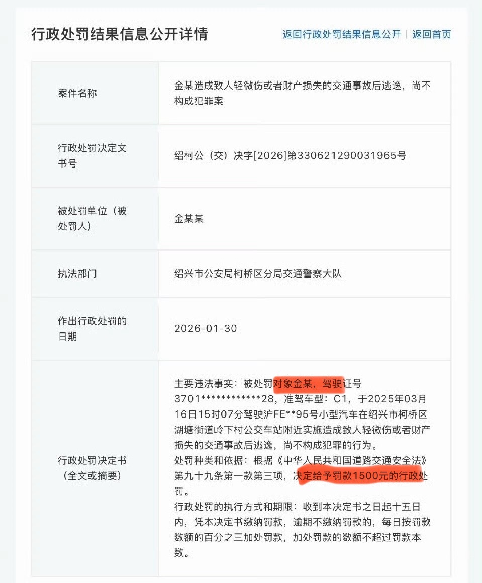 金晨交通事故一事被罚1500!金晨被罚款1500元