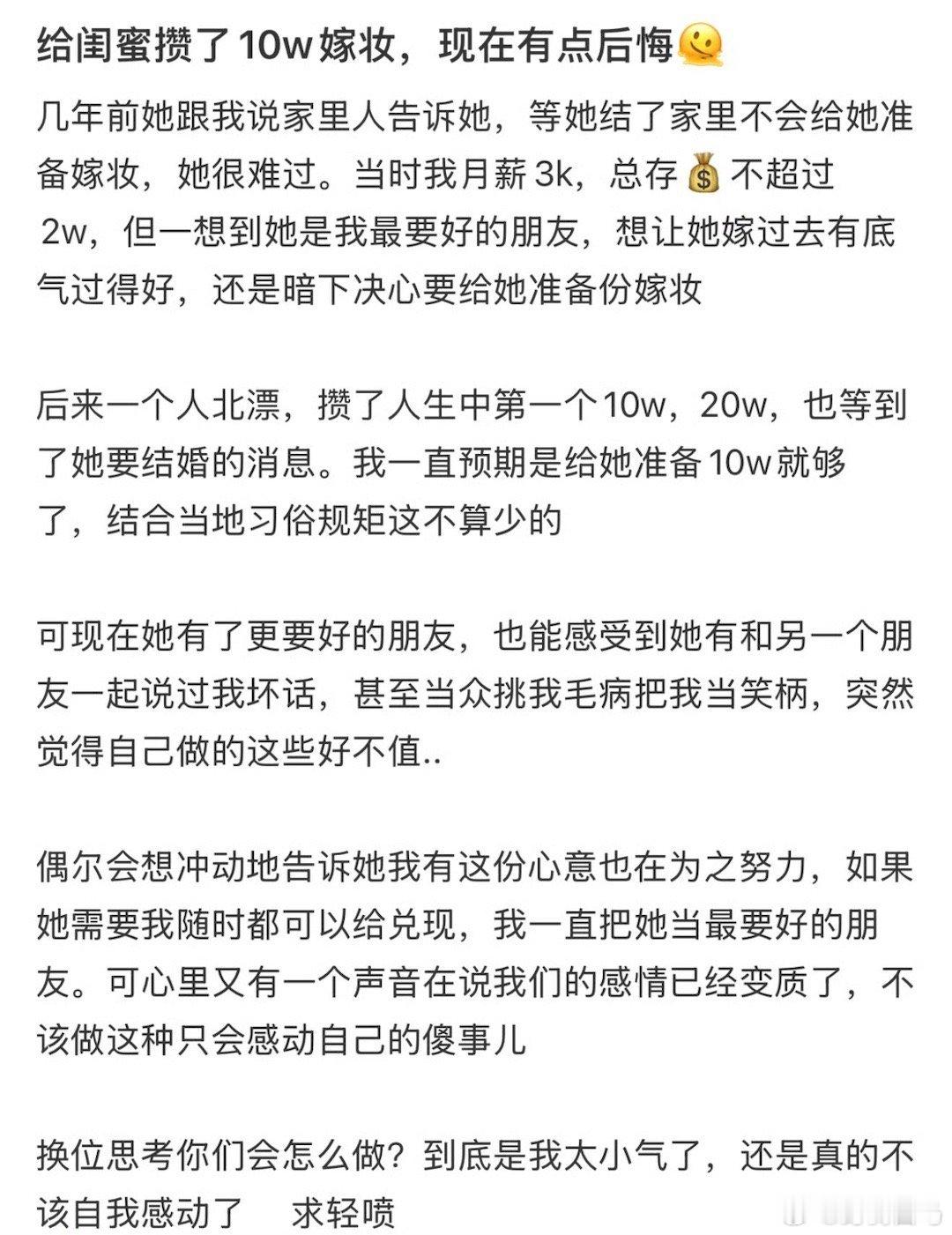 给闺蜜攒了10万的嫁妆,现在不想给了,算小气吗?