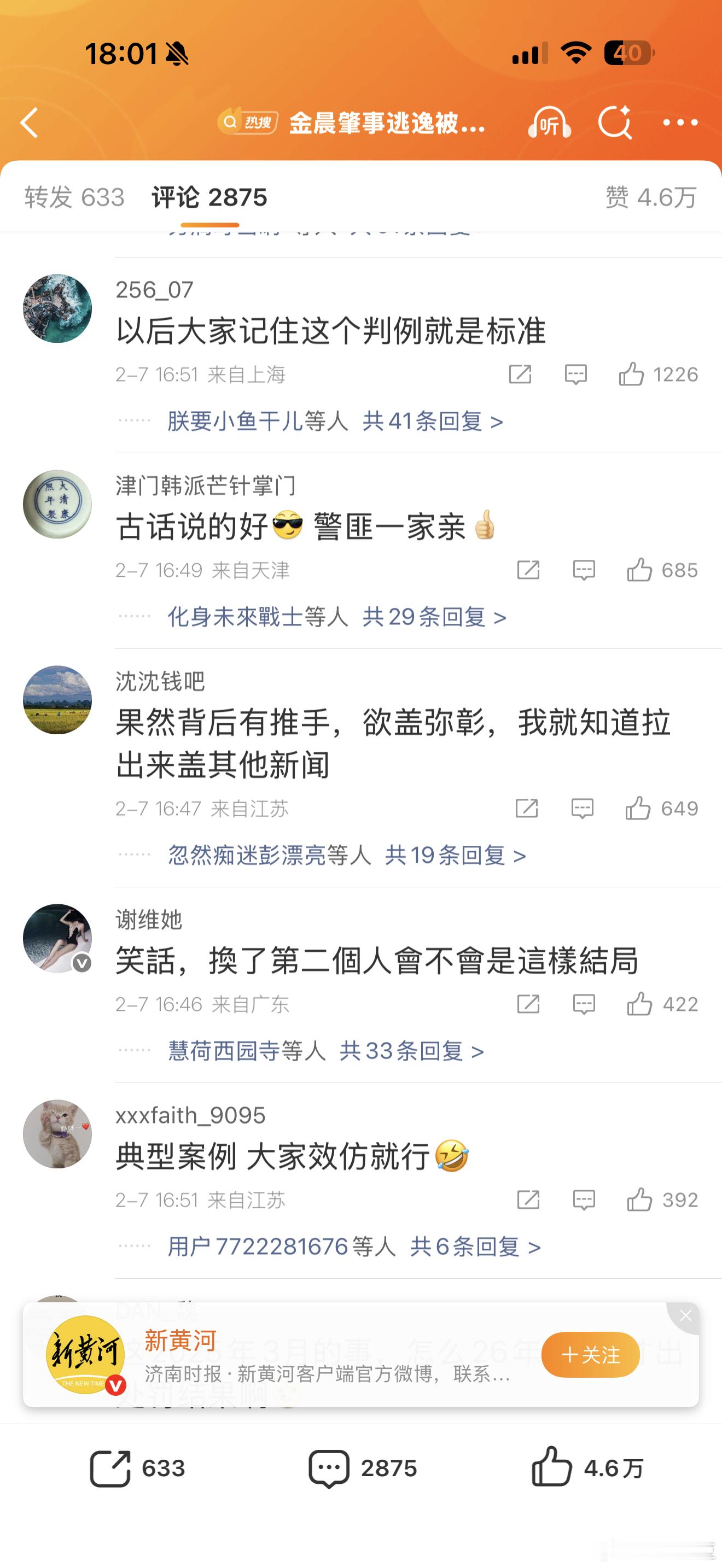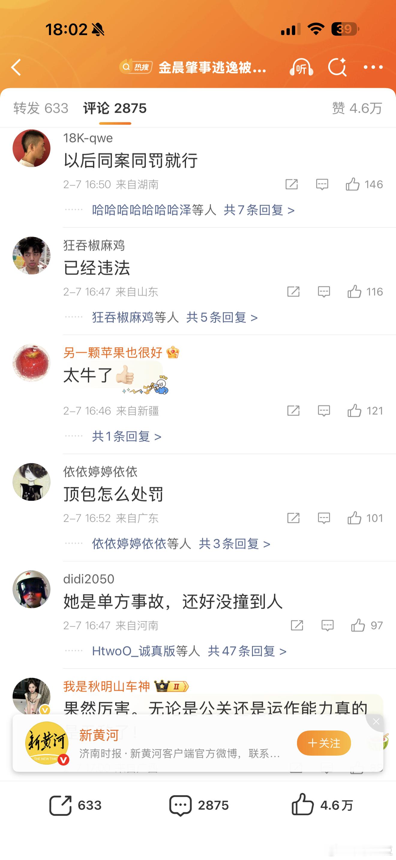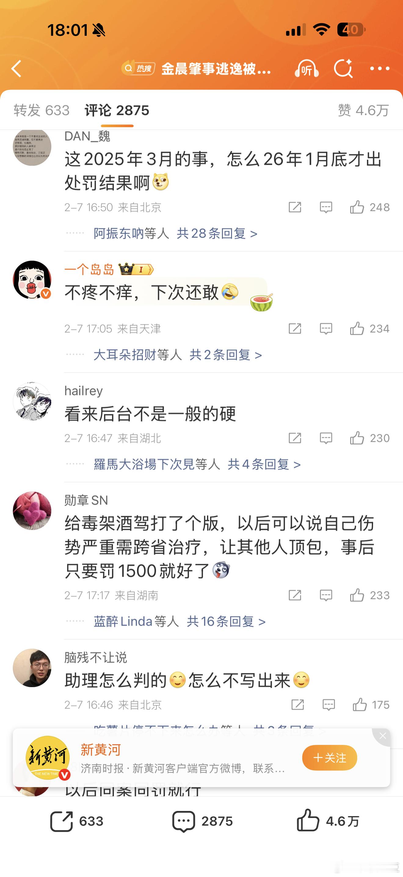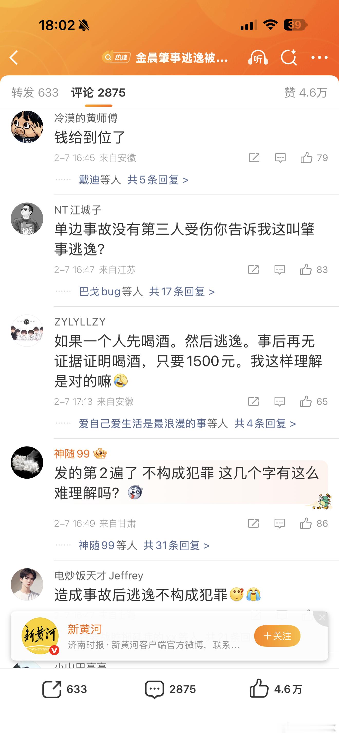 金晨肇事逃逸被罚1500元柯桥这次自己不发声了,由媒体发处罚结果,看看这热搜微博的评论区,声音几乎一边倒,金晨粉丝四处出击,非但没能捂嘴,效果适得其反