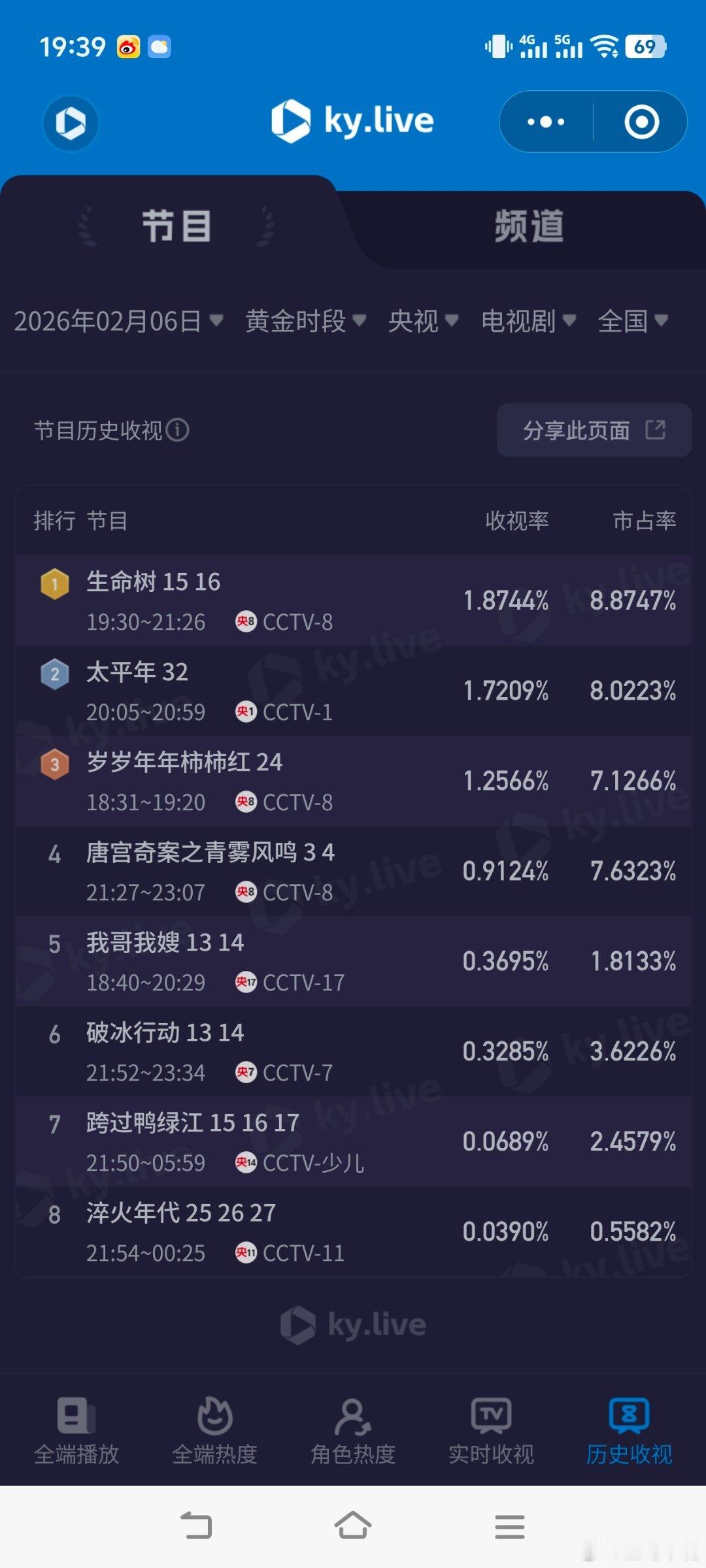 生命树这部剧是标杆的存在2月6日cvb收视日报太平年单集3.175,酷云1.7209,系数1.845