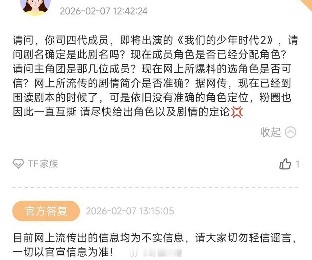 之前一直在说的TF四代成员将要参演《我们的少年时代2》,现在时代峰峻官方回复说是不实信息,那之前粉丝还在撕角色,不就是白干一场
