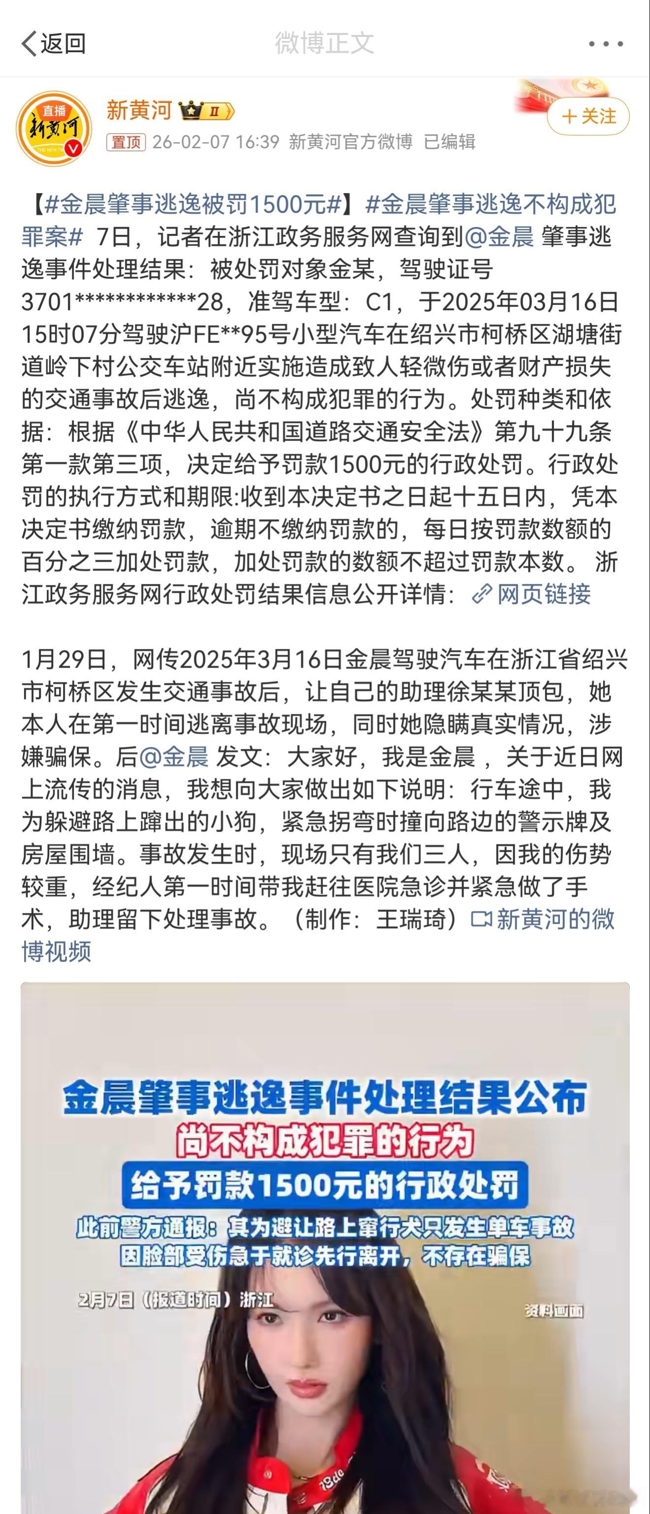 金晨肇事逃逸被罚1500元 官方处罚结果出来了,你们怎么看?