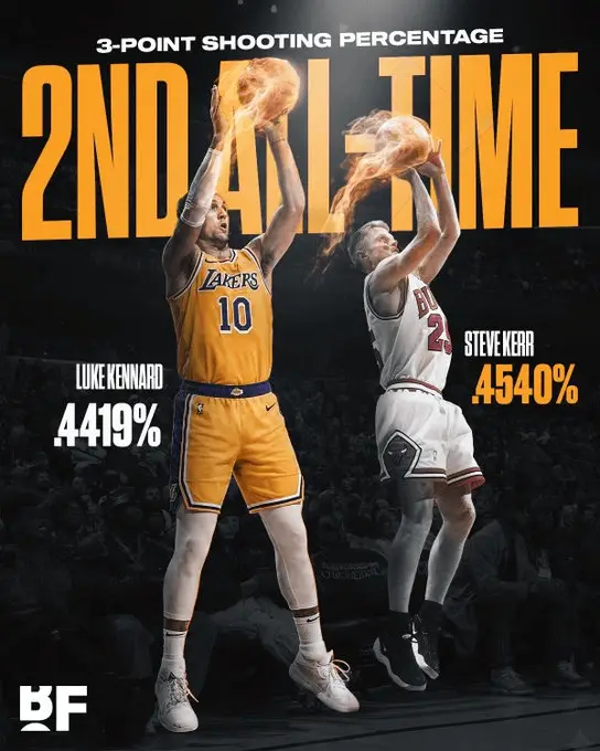 明天能进几个?湖人新援肯纳德以44.19%的三分命中率位列NBA历史第二,仅次于史蒂夫-科尔(45.40%)。