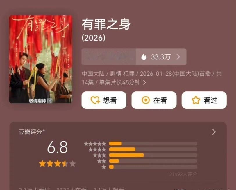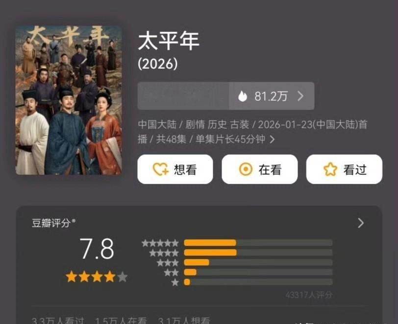 30万人打出7.2,15万人却捧出7.9,最近的国产剧,越来越反直觉了。 别光盯着赵丽颖的《与凤行》,流量撑起的盘子大,但口碑的“含金量”却被李现的《春色寄情人》甩开身位。 一个靠着S+的排场和主演光环稳住基本盘,一个却用细腻的剧情悄悄冲顶。 至于胡一天的《惜花芷》,6.5分卡在及格线边缘,5万人的小样本量,甚至还没能掀起真正的水花。 它就像班里的中等生,存在感不强,前路不明。 流量只能决定谁先上桌,而口碑,才决定谁能把这顿饭吃完。