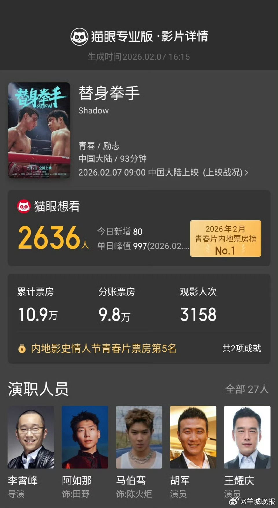 【#肖战连包3场支持替身拳手# 】据猫眼专业版云包场显示,包场支持电影《替身拳手》。影片由监制,导演,、领衔主演,领衔主演,王耀庆、、领衔主演,影片现已全国上映。#肖战网络视听出图##肖战北京台春晚梦回藏海##肖战压轴亮相网络视听盛典红毯#肖战 (编辑:惠天骄;审签:谢杨柳)