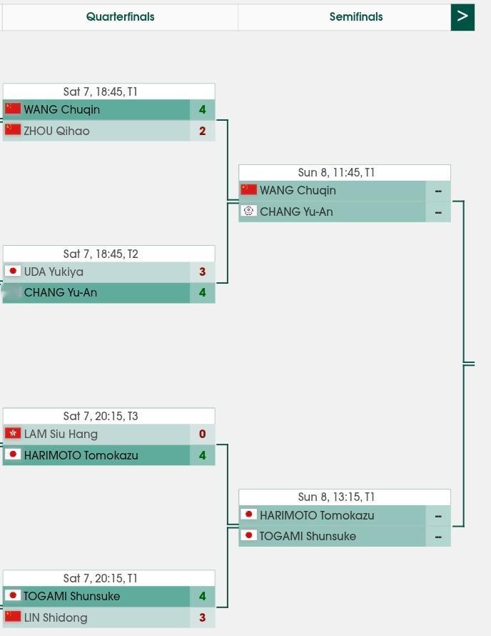 亚洲杯男单四强:国乒剩独苗! 第35届国际乒联亚洲杯,男单四分之一决赛结束,王楚钦战胜队友周启豪晋级,林诗栋与户上隼辅战满7局,林诗栋3比4不敌对手无缘四强! 张佑安4比3艰难战胜宇田幸矢晋级!张本智和4比0轻松战胜中国香港队林兆恒晋级! 半决赛对阵: 王楚钦vs张佑安 户上隼辅vs张本智和 王楚钦在技术和经验方面都要远好于张佑安,战胜对手不成问题,同为左手球员,注意其线路变化即可! 国乒仅剩王楚钦一人了,加油!