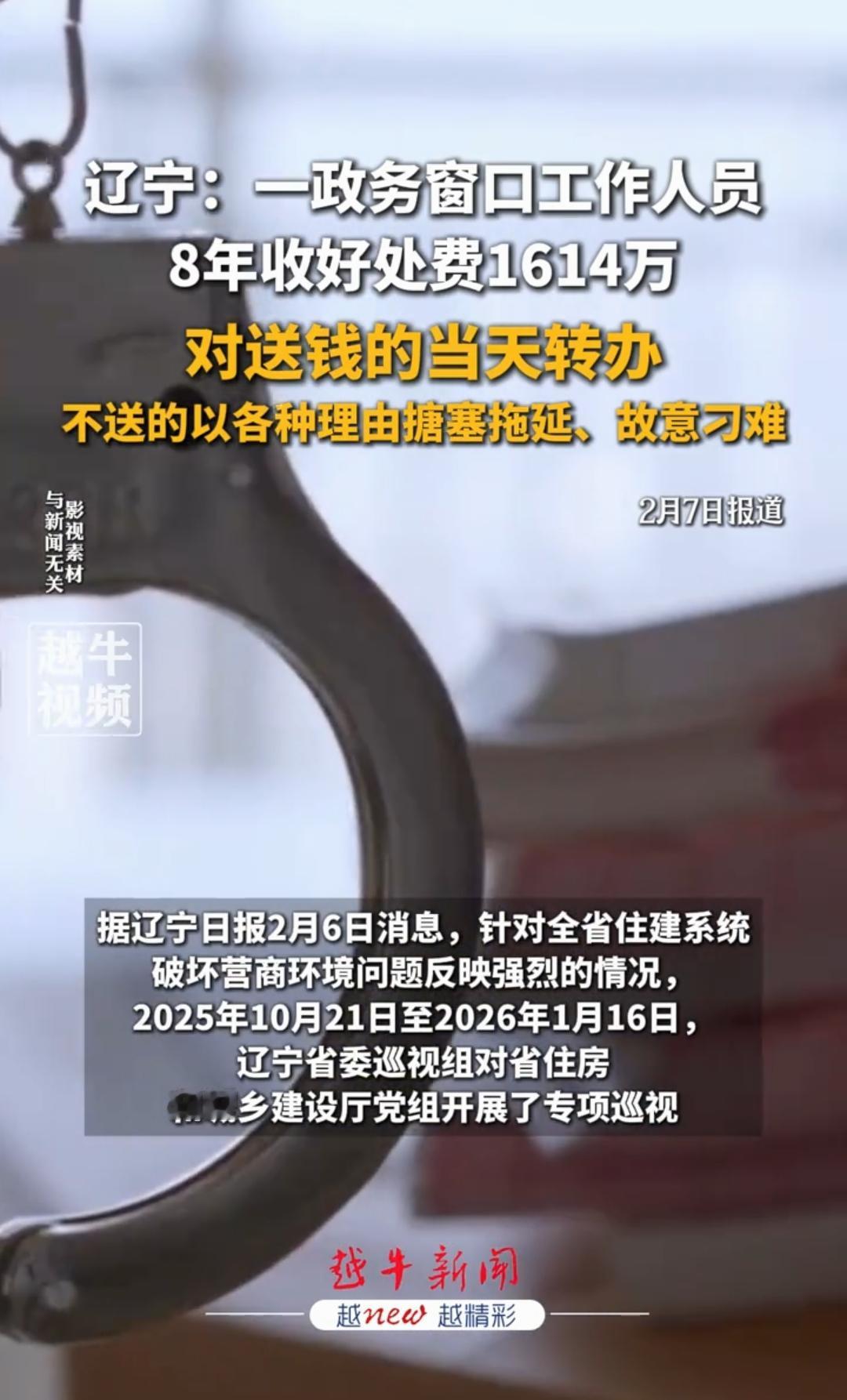 直接震惊了。 辽宁披露:政务大厅一工作人员,对送钱的当天转办,不送的故意刁难,8年收取好处费1614万元。