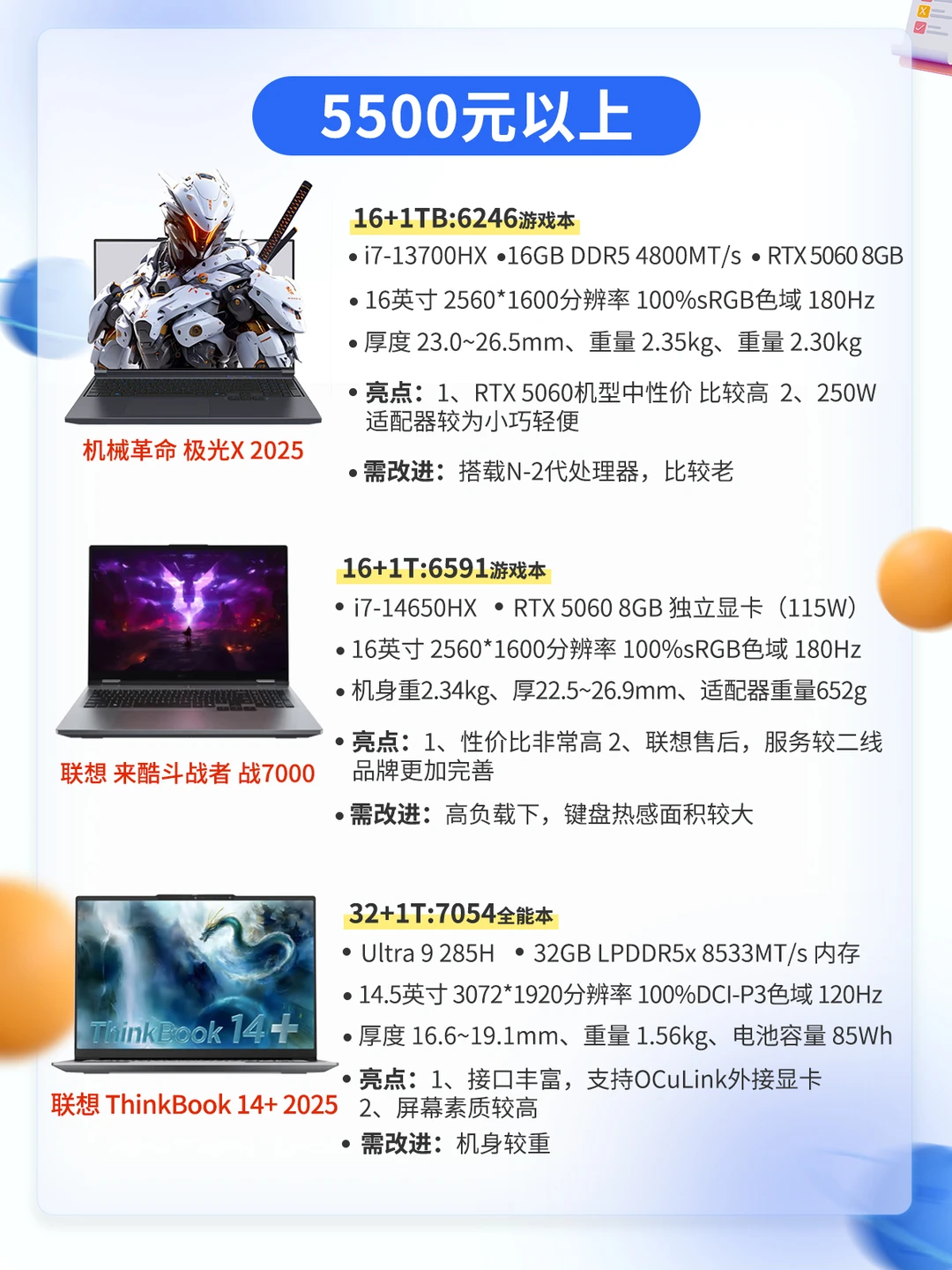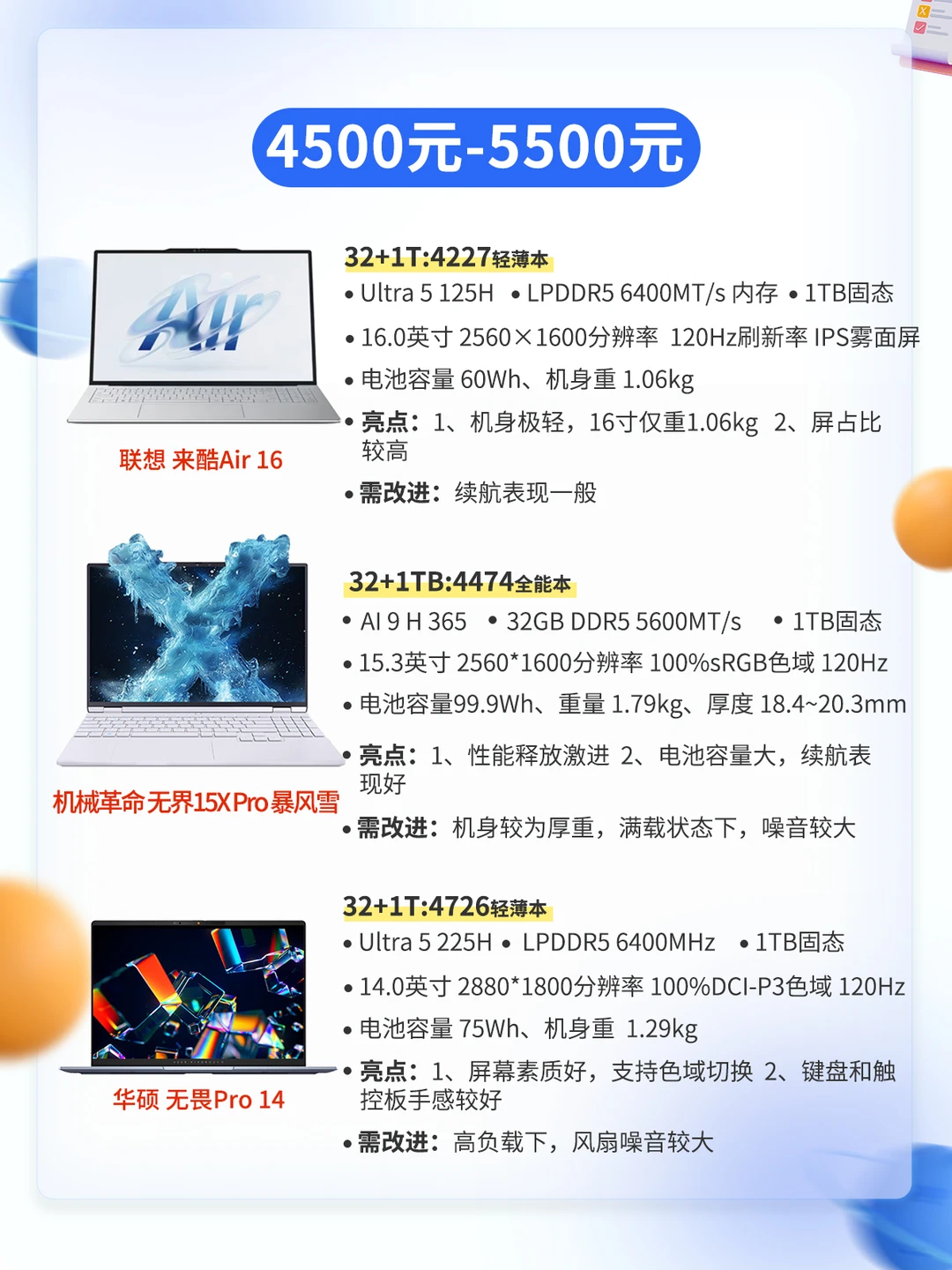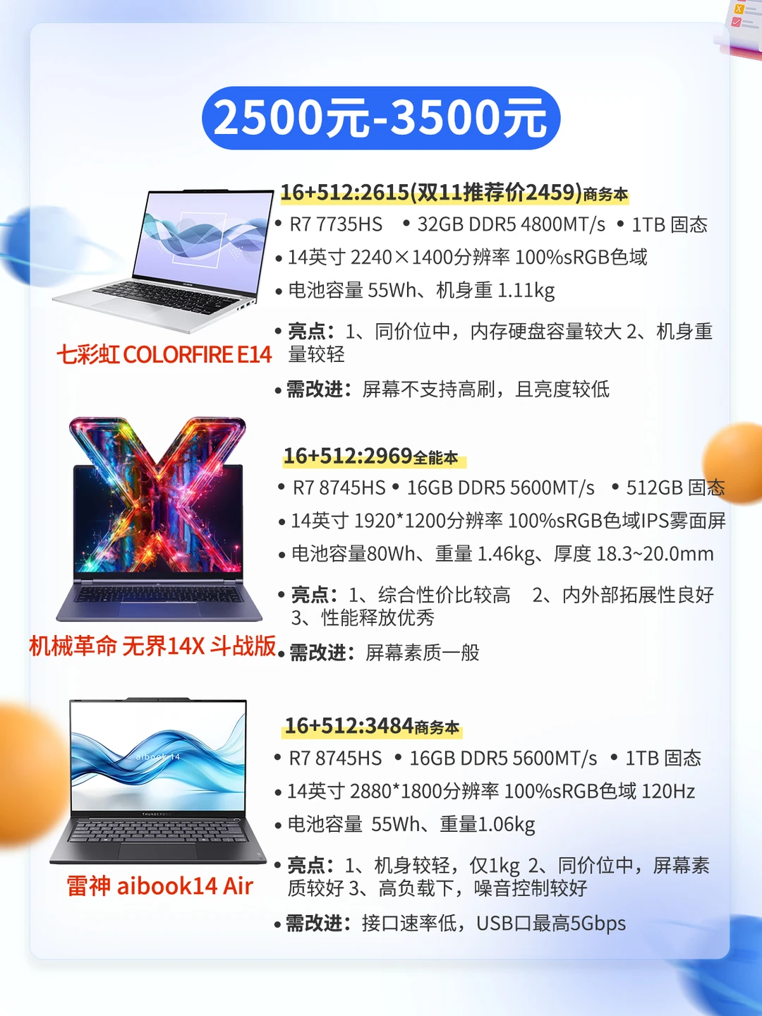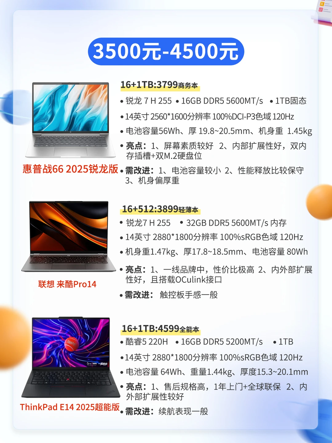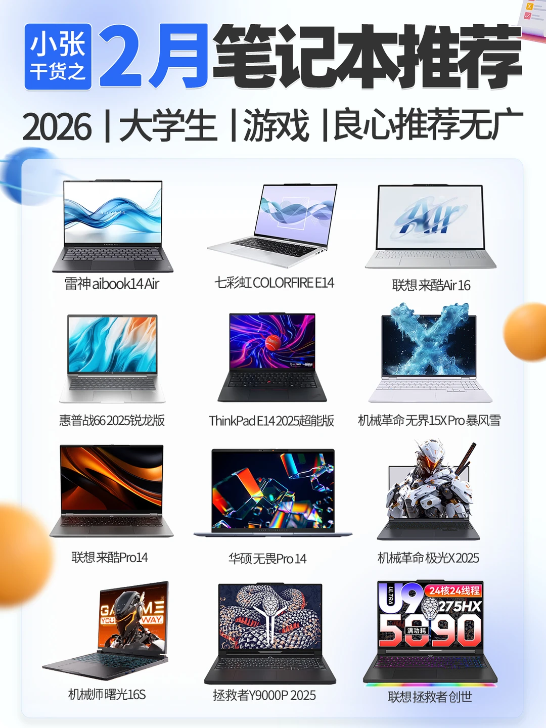 同学们,26年2月份笔记本电脑推荐它又按时来啦,最近笔记本电脑受内存涨价的影响,价格也涨价凶的很,不是刚需的话现在不建议入手,等年后再看看价格走势 ⭕️结合之前的旧机型、本期为宝子们盘点了双11期间10多款可以根据预算需求无脑入的性价比机型,其中还标明了当前价格,给宝子们参考~ 本文共有8️⃣张图片,请左滑查看更多 本期根据价位区间进行区别,总结了每款机器的屏幕、芯片、充电续航、优点、以及需改进的地方 买前必看(请看图2) 2500-3000元(请看图3) 3500-4500元(请看图4) 4500-5500元(请看图5) 5000元以上(请看图6、图7) 因篇幅限制,还有些不错的电脑没法一一提到,请大家谅解❤ 后续每个月都会为大家带来手机、平板电脑。笔记本等数码产品推荐攻略,关注小张了解更多数码知识和产品推荐~