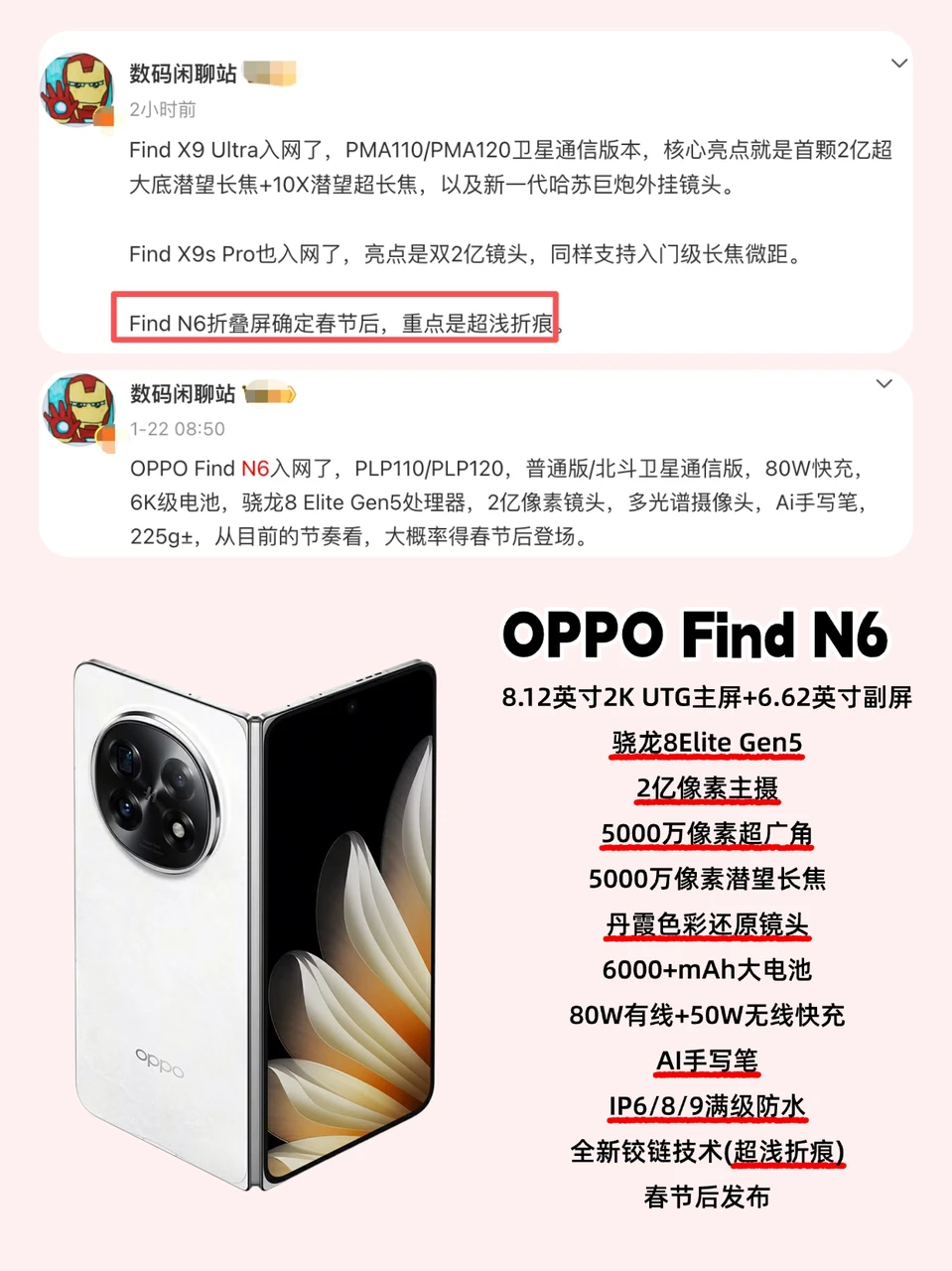 这两天上网看到好多关于苹果折叠屏的消息,我本来想等等iPhone18ProMax的,现在有点犹豫了,因为超浅折痕和阔折叠比例,这两个亮点在目前折叠屏里还是很少[暗中观察R]希望苹果能做出来! - 但是我还很犹豫,因为国产折叠屏已经发展好几年了,华为OPPO等在软件交互、铰链、影像等优势明显,特别是分屏,OPPO甚至在Find N5时搞了三个应用同时显示的全景虚拟屏,而iPhone连分屏也没有,接下来的Find N6增加了AI手写笔,预计有新花活! - 配置上,苹果折叠屏和iPhone标准版一样没有长焦,而OPPO Find N6不止有潜望长焦,还有2亿像素主摄和丹霞色彩还原镜头,影像看齐直板旗舰,加上6000大电池和超浅折痕,起码折痕领先行业半年!苹果折叠屏来了[笑哭R]国产不慌吧。 -
