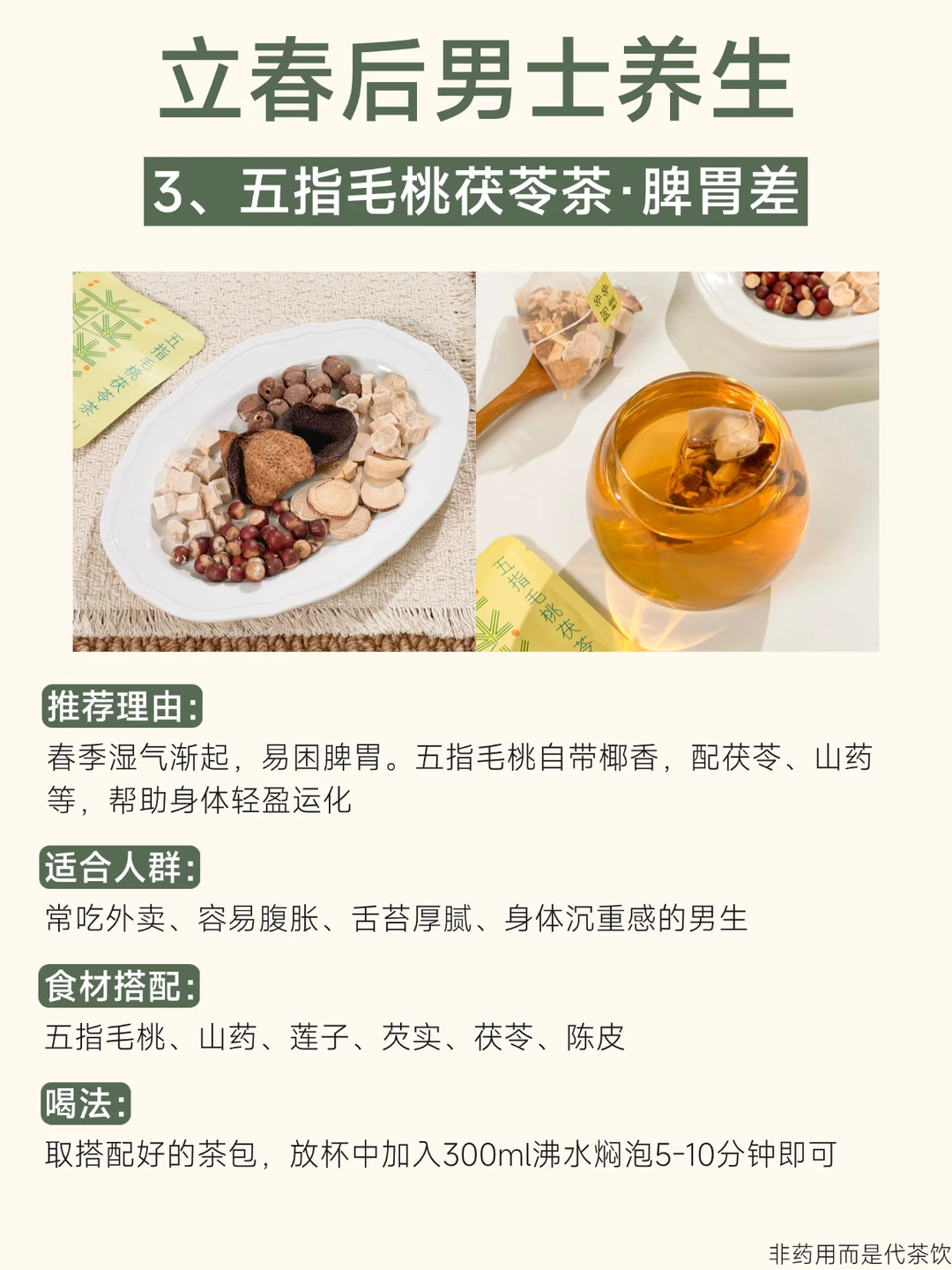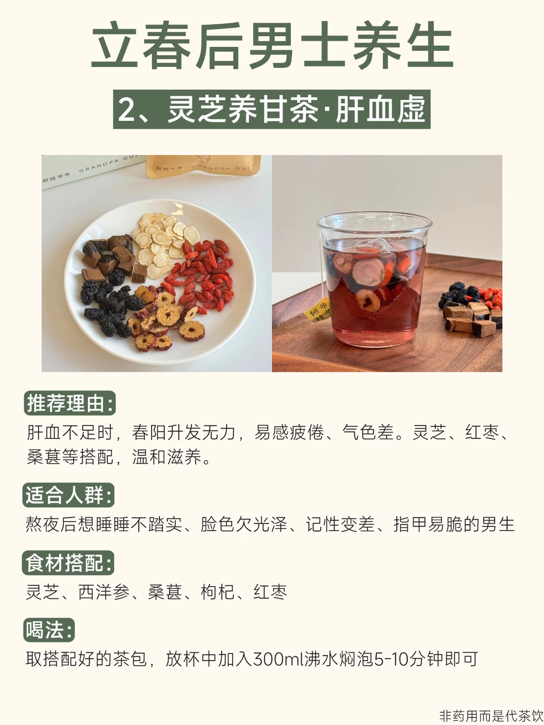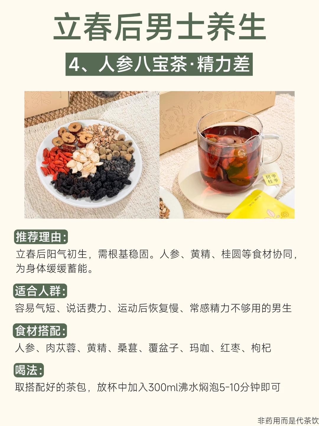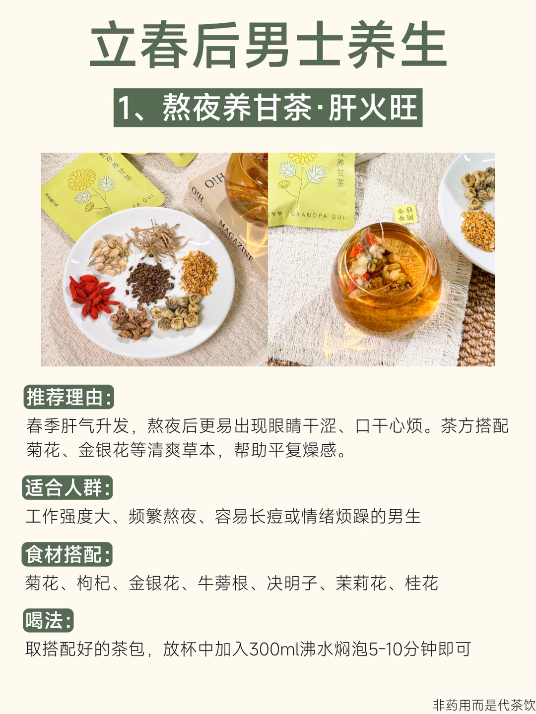 立春一过,阳气始升[太阳R] 正是调动身体活力、养护根基的好时机 尤其对常熬夜、压力大、饮食不规律的男生来说 季节转换时更需温和的滋养 这4杯专为春季搭配的养生茶🍵 陪你抓住阳气生发的黄金期 ①熬夜养甘茶:熬夜肝火旺喝 ②灵芝养甘茶:肝血虚睡不好喝 ③五指毛桃茯苓茶:脾虚胃口差喝 ④人参八宝茶:阳气不足精力差喝 所有茶都是草本配方,0添加 独立茶包设计,办公室、出差、宿舍都能轻松泡。 春天万物生长的季节, 不妨借天地之势,悄悄把状态养回来~ - 非药用而是代茶饮