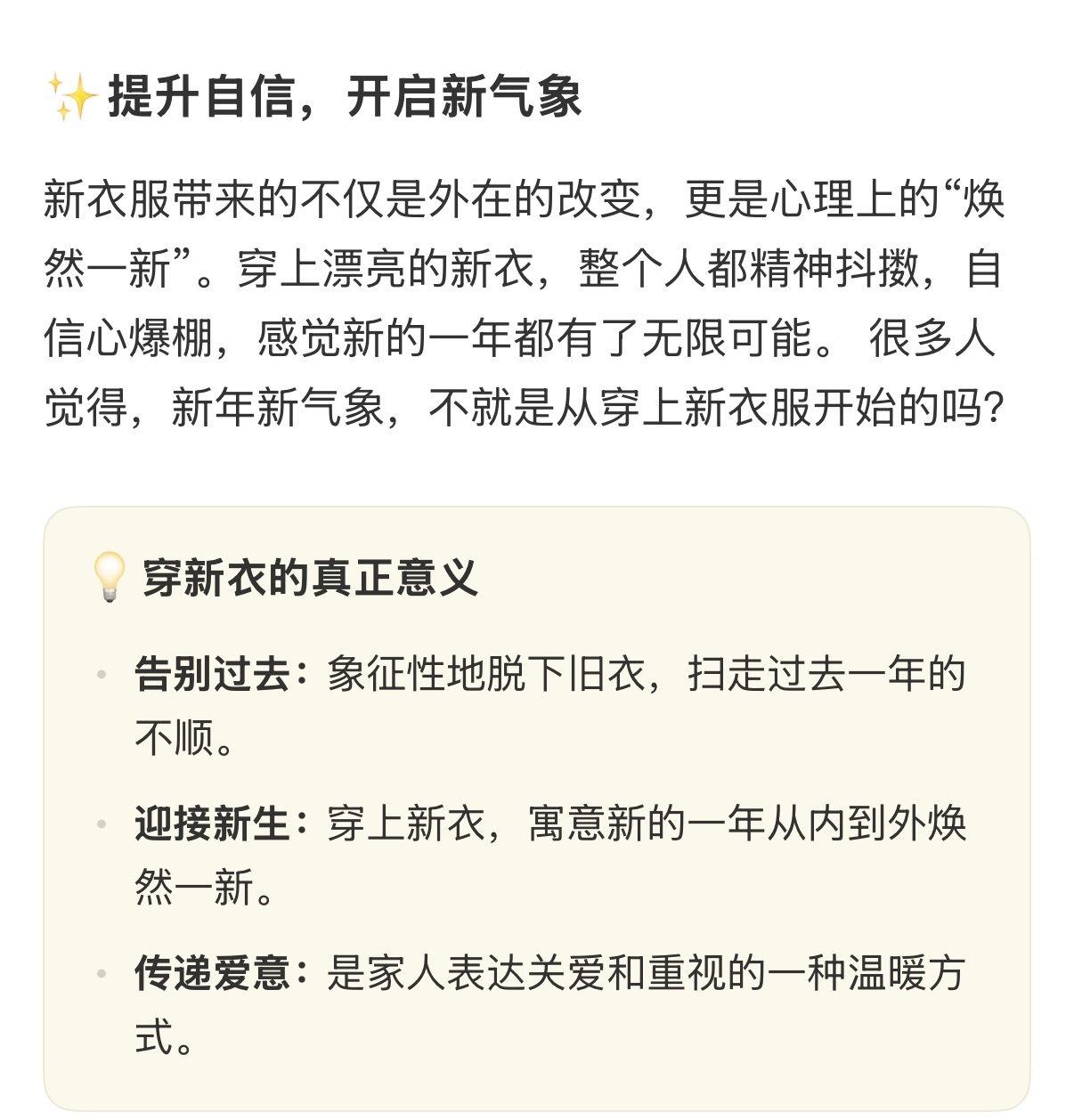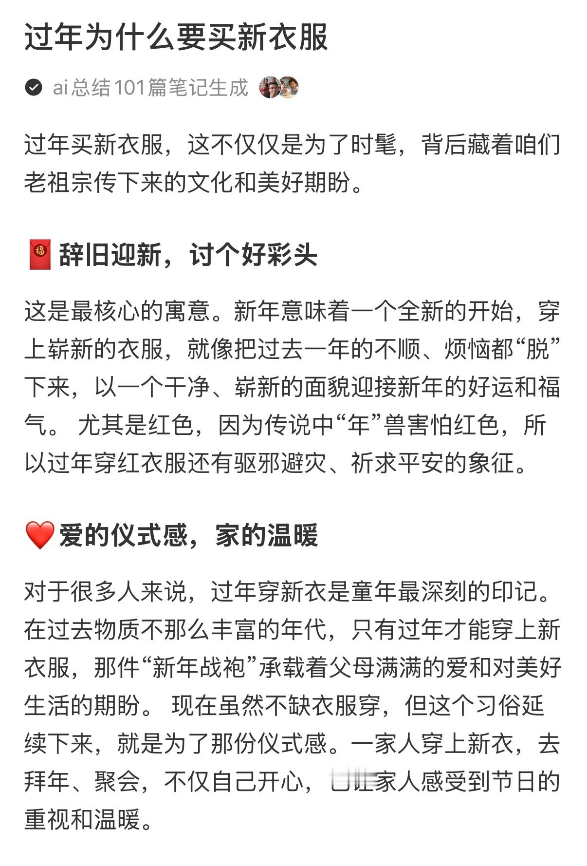 小朋友的过年问题能有多离谱今天穿新衣服时,小外甥突然问:“为什么过年要穿新衣服?平时穿旧的不行吗?”我只知道是习俗,查了下🍠AI的回答超有意思:“过年穿新衣服是辞旧迎新,就像给小树苗换个新土壤,新的一年要漂漂亮亮的呀”,小孩听完赶紧去镜子前转圈圈,说自己是“新年小树苗”🌱